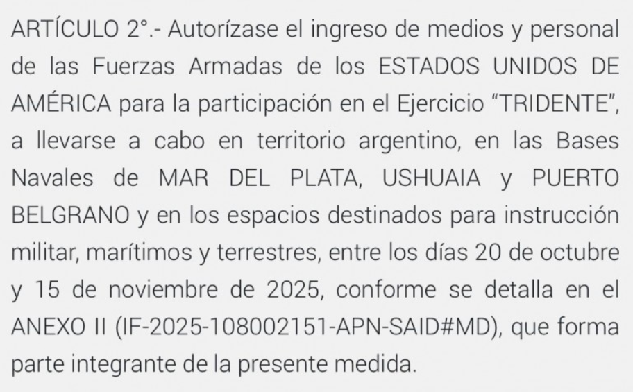 El Gobierno autorizó por decreto el ingreso de las tropas extranjeras a territorio nacional para realizar actividades en las Bases Navales de Mar del Plata, Ushuaia y Puerto Belgrano del 20 de octubre al 15 de noviembre. Las mismas estarán encabezadas por las Fuerzas Navales de Operaciones Especiales del Comando Sur de los Estados Unidos, en una nueva señal de alineamiento con la Casa Blanca, ahora en el terremoto militar.