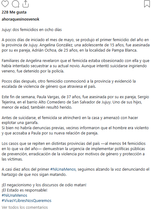 El fin de semana siguiente, Paula Vargas, de 37 años fue asesinada por su expareja en su casa en el barrio Alto Comedero, en San Salvador de Jujuy. Estaba allí uno de sus hijos, menor de edad, que resultó herido. El femicida se mató, pero antes, se atrincheró en la casa y amenazó con explotar la garrafa. No había denuncias en su contra, pero en el barrio sabían que era violento y que hostigaba a Paula porque tenía novio.