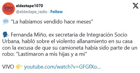 La excusa que pusieron los policías para irrumpir en su domicilio a la medianoche fue la presunta búsqueda de una camioneta que supuestamente había sido utilizada en un robo, pero que Miño había vendido en julio. «Ese vehículo ya no era nuestro», insistió la dirigente política.