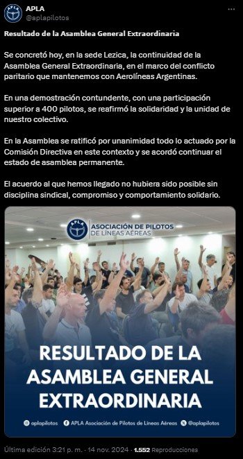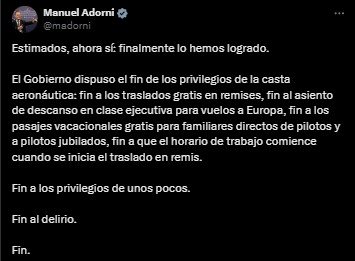 Desde el Gobierno celebraron el acuerdo. “Estimados, ahora sí: finalmente lo hemos logrado. El Gobierno dispuso el fin de los privilegios de la casta aeronáutica: fin a los traslados gratis en remises, fin al asiento de descanso en clase ejecutiva para vuelos a Europa, fin a los pasajes vacacionales gratis para familiares directos de pilotos y a pilotos jubilados, fin a que el horario de trabajo comience cuando se inicia el traslado en remis. Fin a los privilegios de unos pocos. Fin al delirio”, escribió el vocero presidencial Manuel Adorni.
