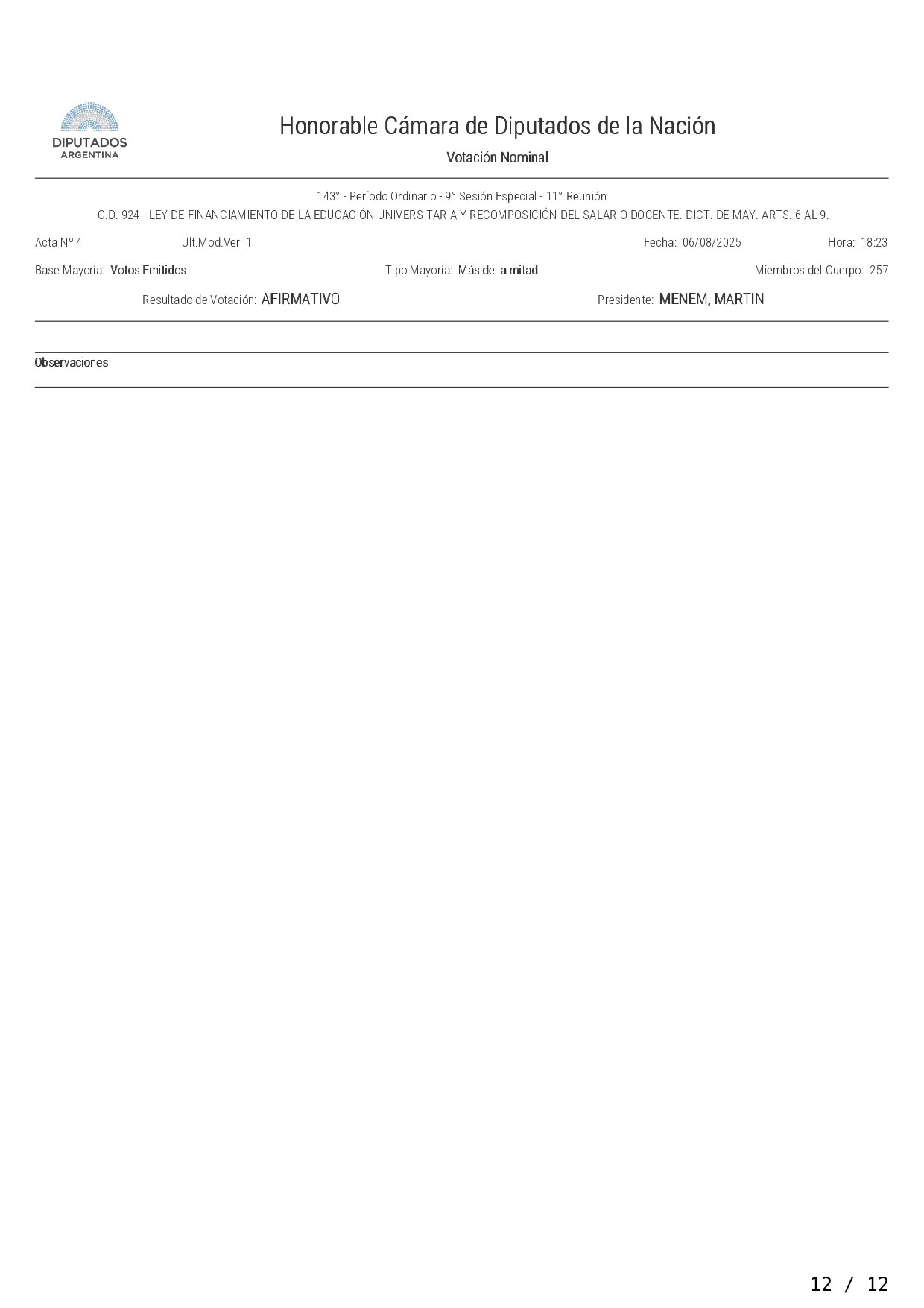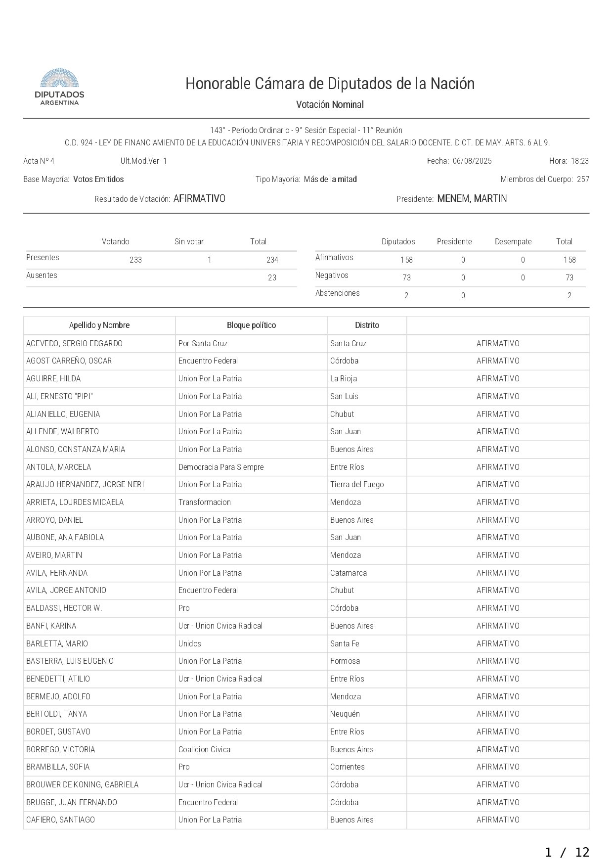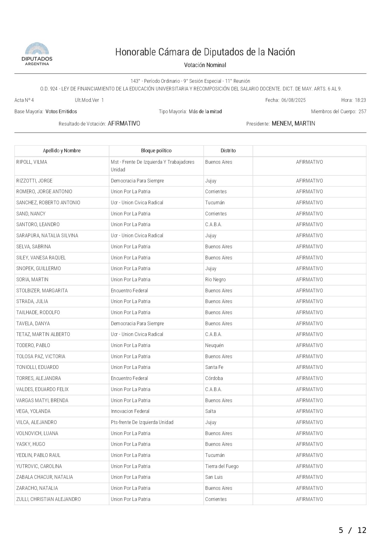 La Cámara de Diputados aprobó y giró al Senado este miércoles el proyecto que otorga y actualiza fondos a las universidades nacionales y la recomposición del salario docente. El mismo recibió el visto bueno con 158 votos afirmativos, 75 negativos y 5 abstenciones, en un nuevo revés al gobierno de Javier Milei.