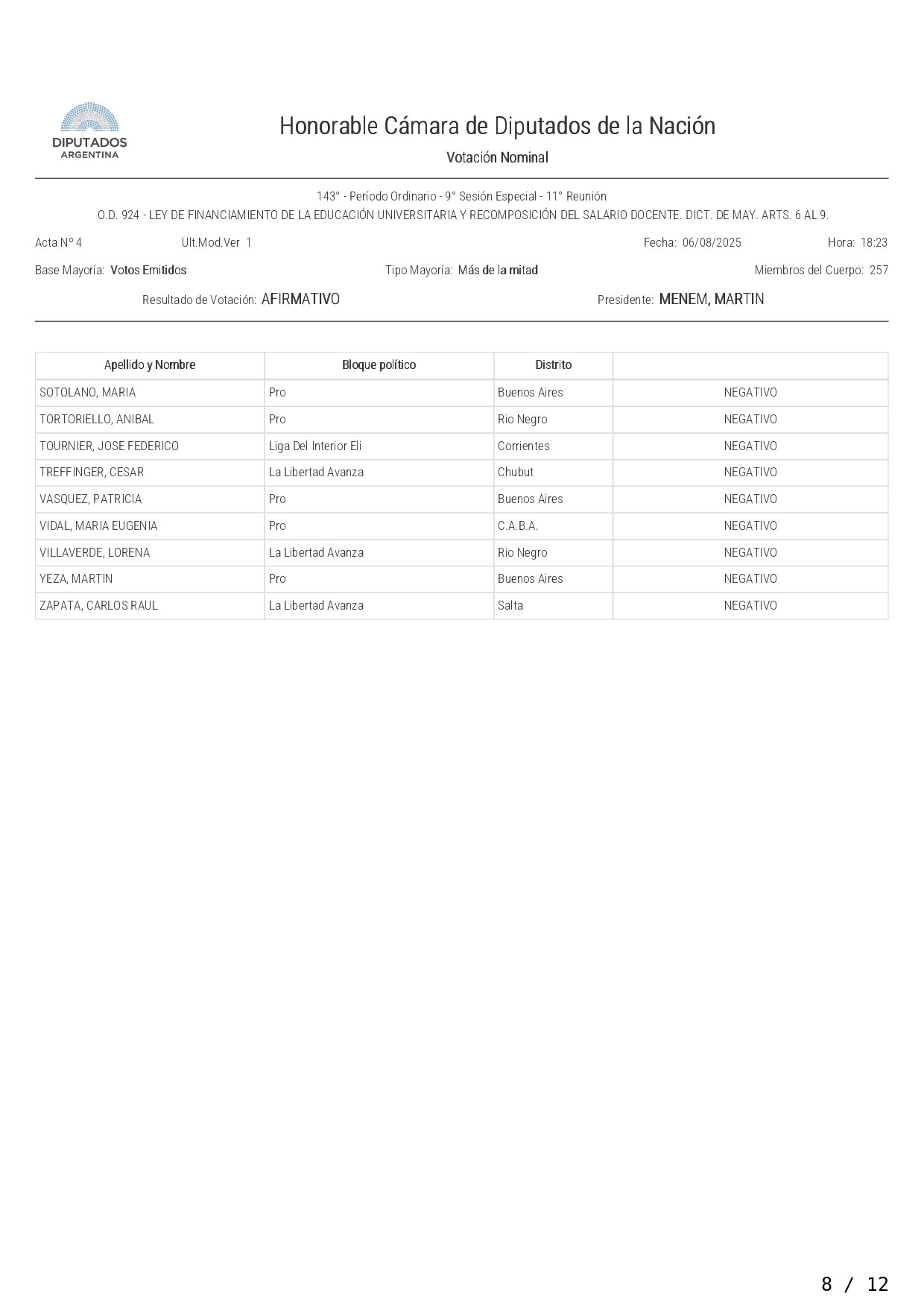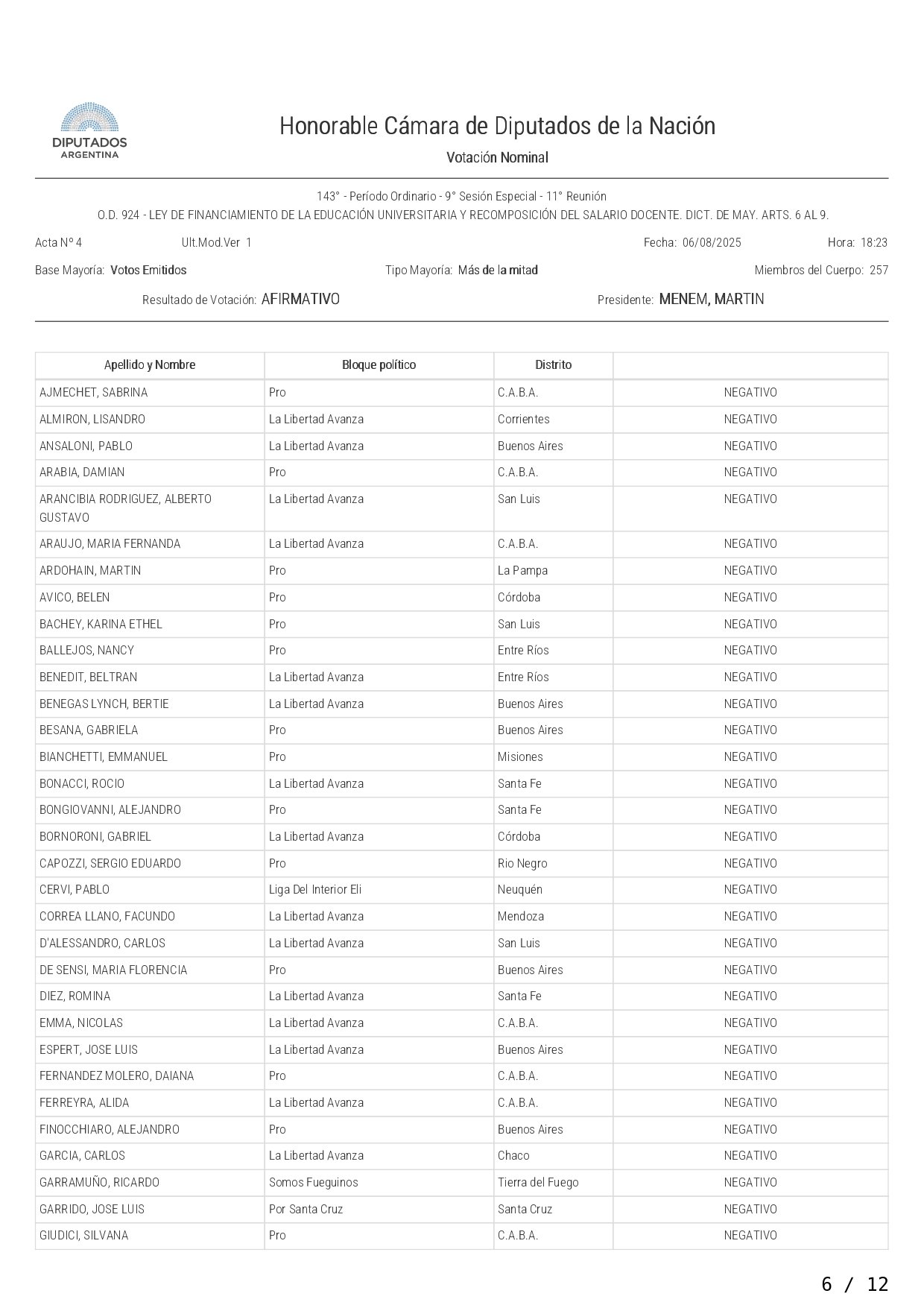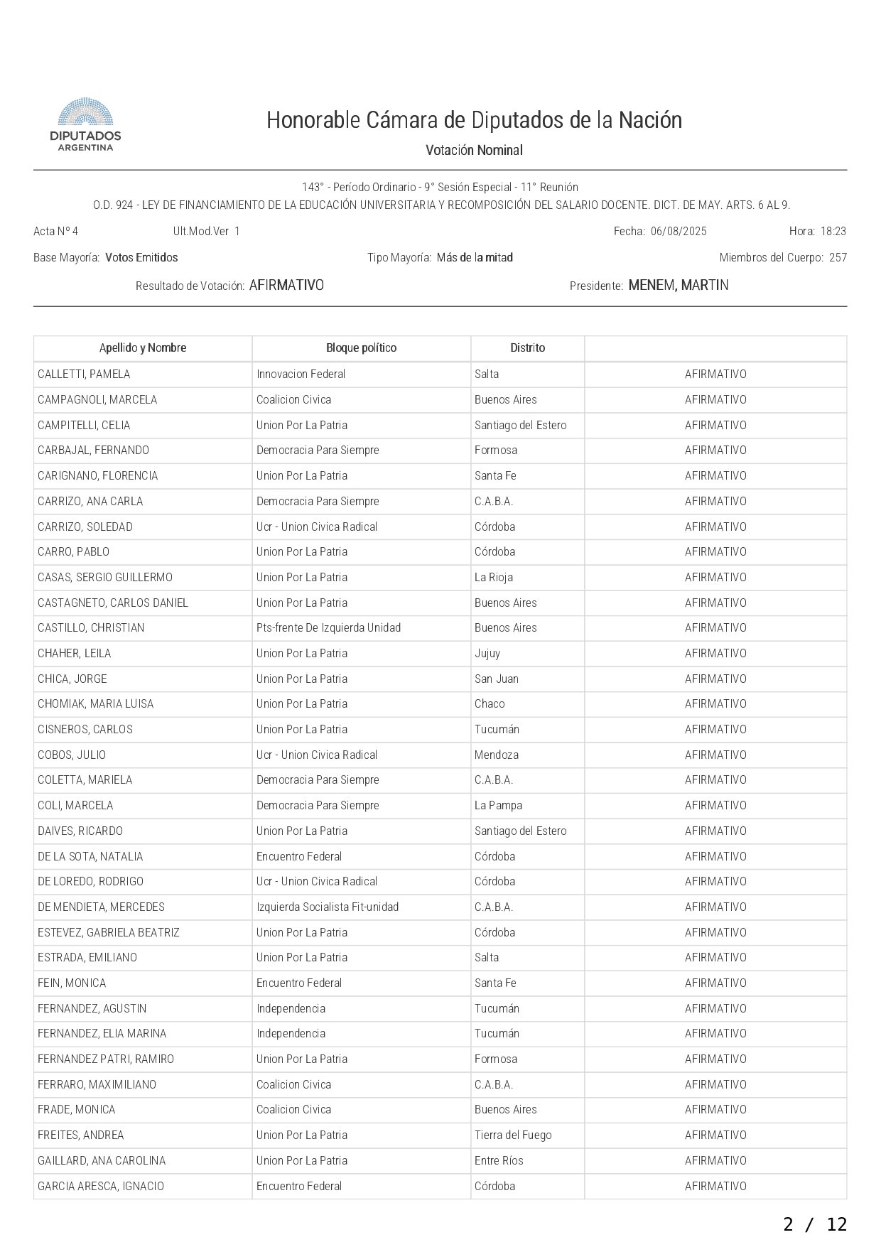 La Cámara de Diputados aprobó y giró al Senado este miércoles el proyecto que otorga y actualiza fondos a las universidades nacionales y la recomposición del salario docente. El mismo recibió el visto bueno con 158 votos afirmativos, 75 negativos y 5 abstenciones, en un nuevo revés al gobierno de Javier Milei.