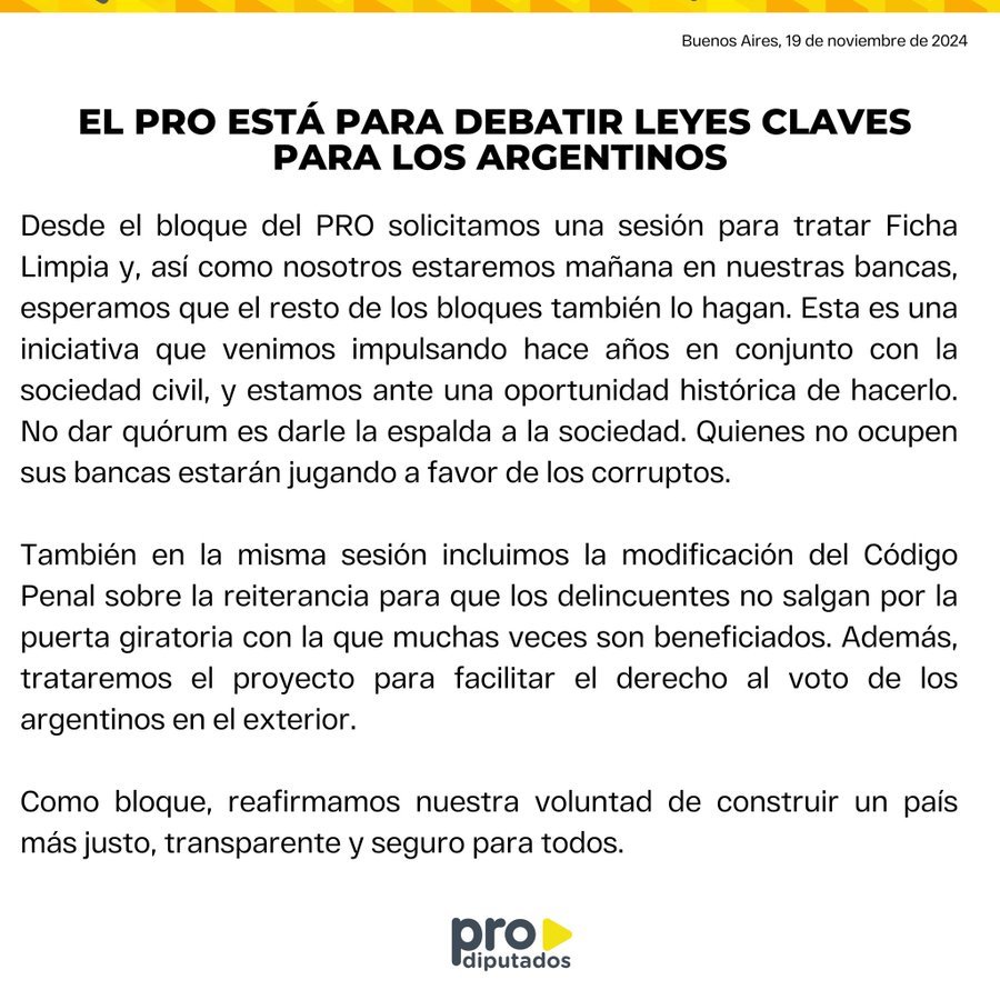«Esta es una iniciativa que venimos impulsando hace años en conjunto con la sociedad civil, y estamos ante una oportunidad histórica de hacerlo. No dar quórum es darle la espalda a la sociedad. Quienes no ocupen sus bancas estarán jugando a favor de los corruptos», señalaron.