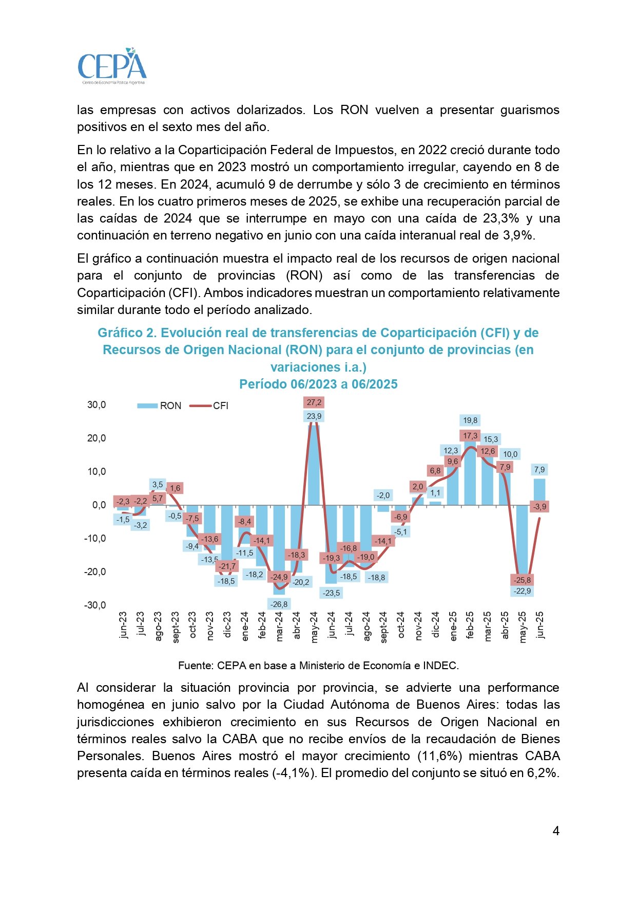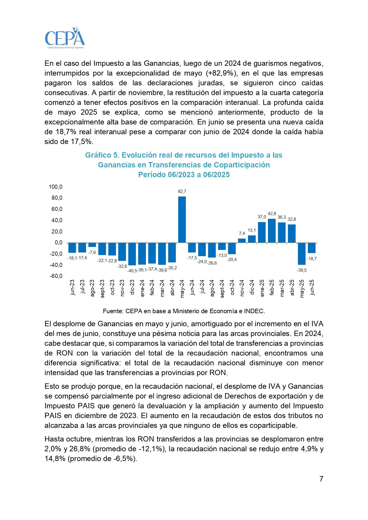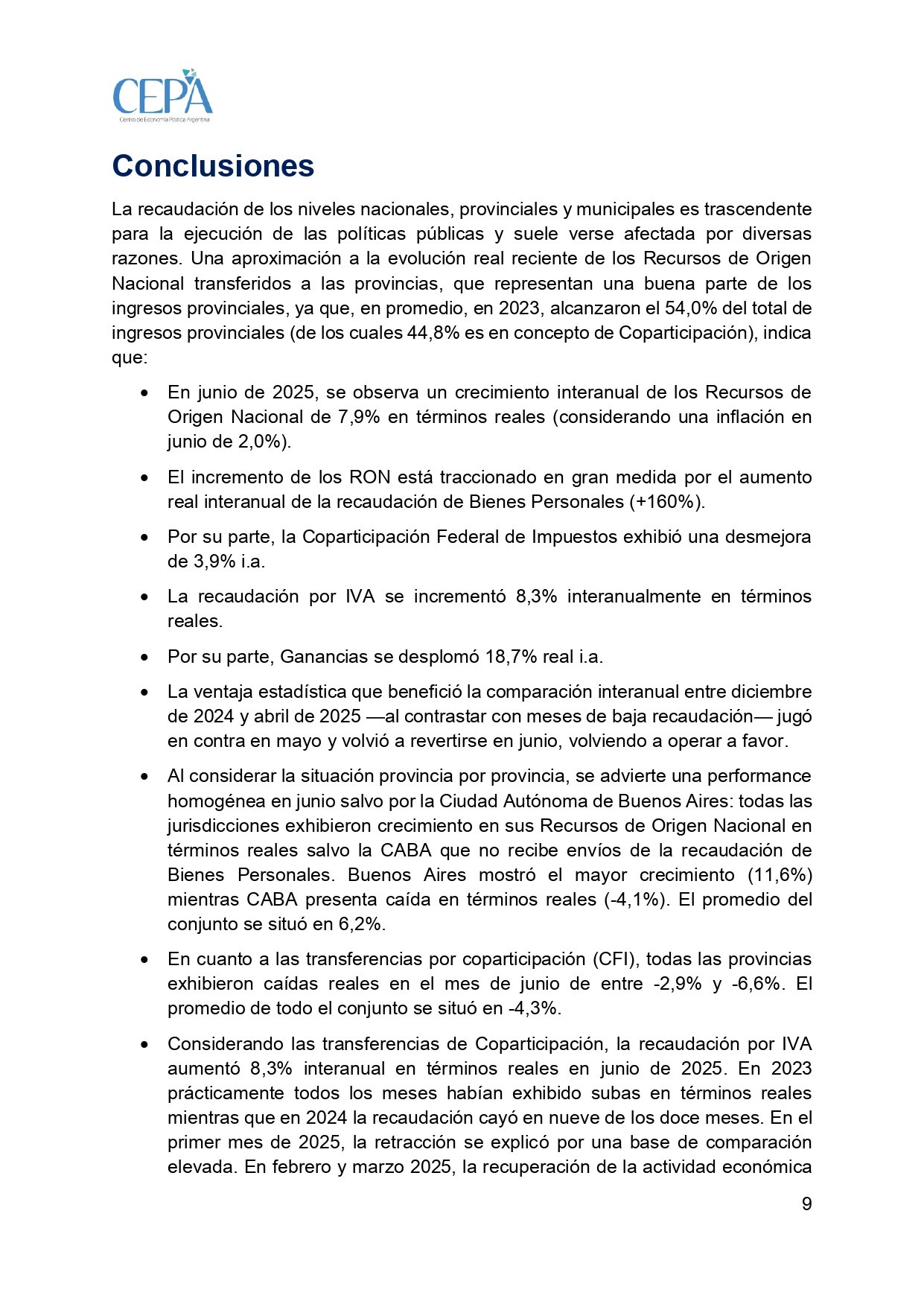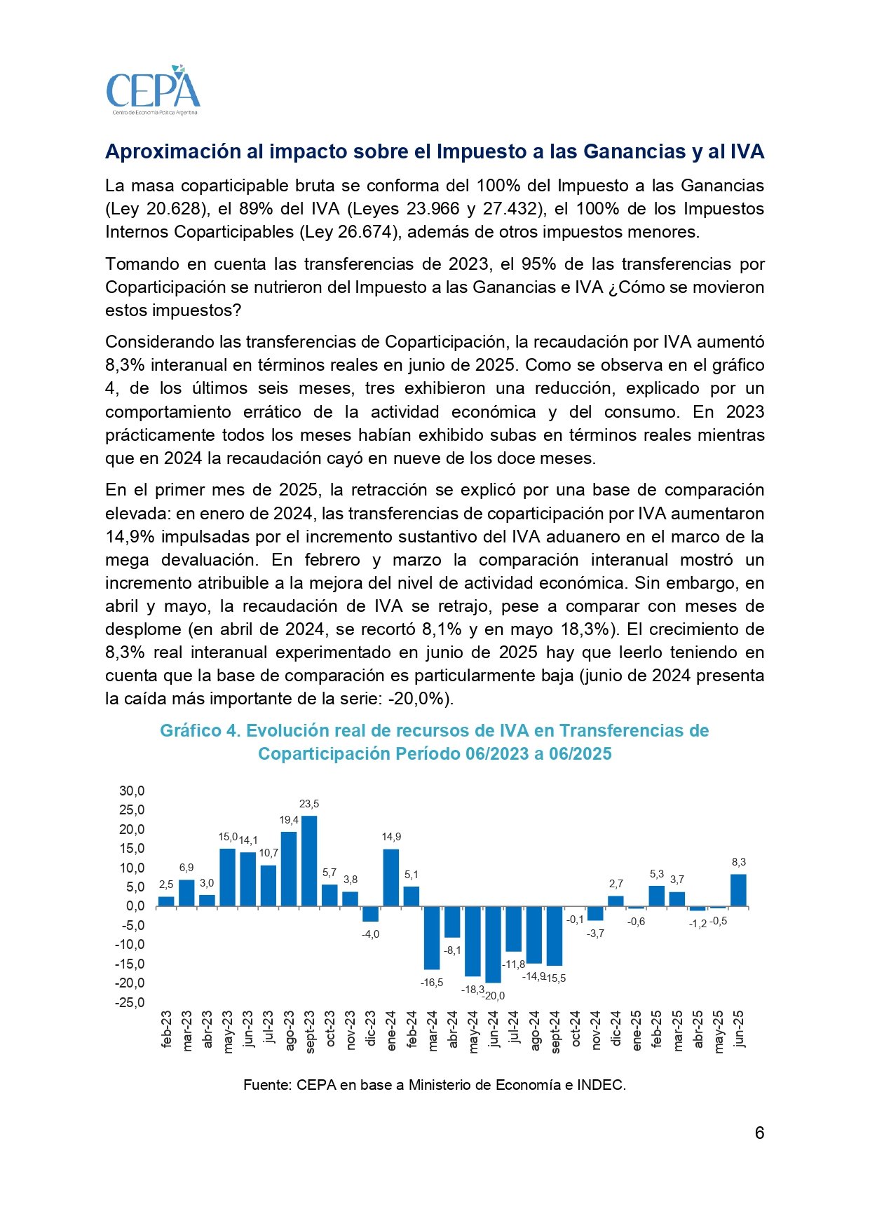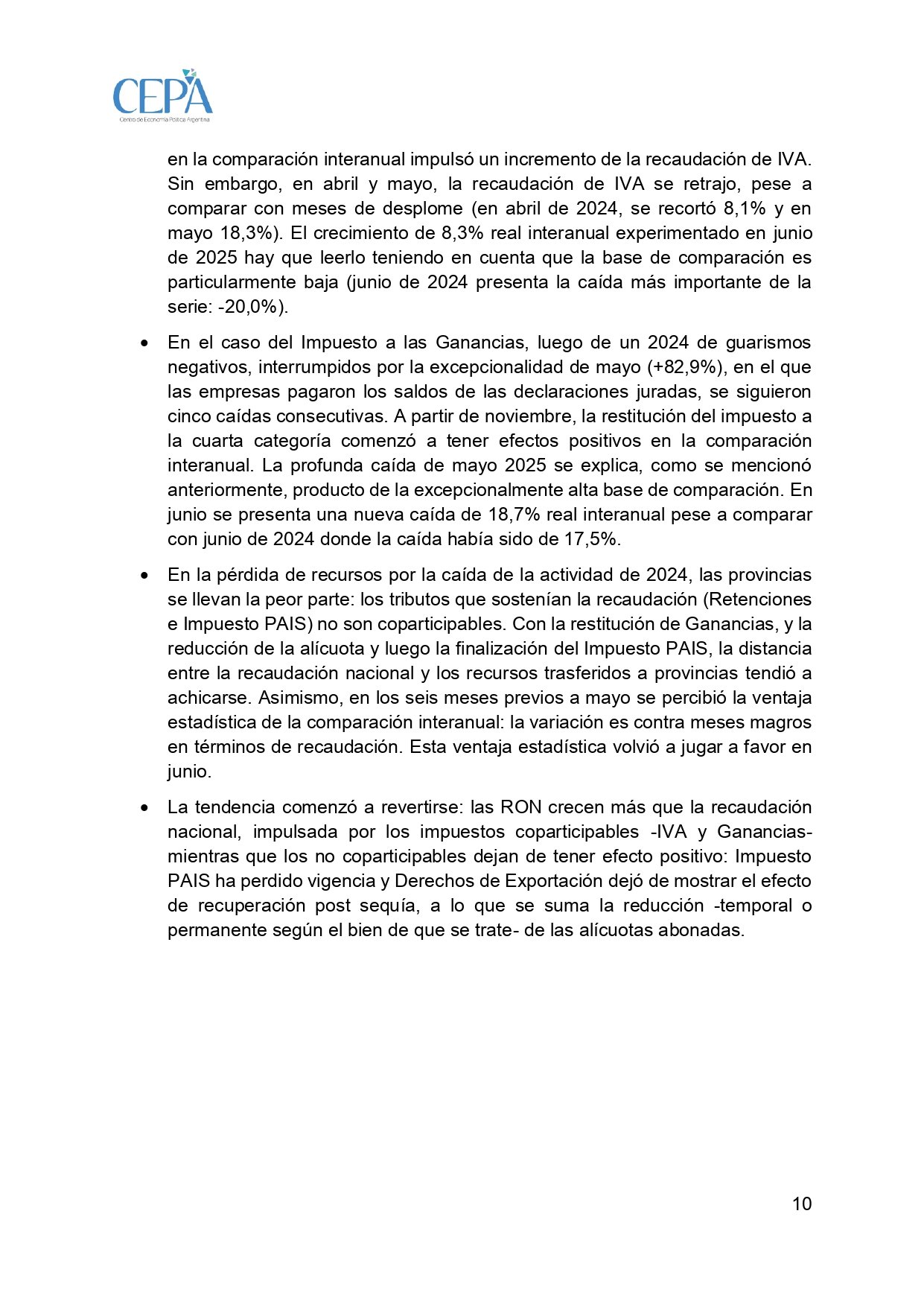 Un informe del Centro de Economía Política Argentina (CEPA) reveló que la Coparticipación Federal cayó un de 3,9% interanual el último mes, pese a que la recaudación por IVA se incrementó 8,3% interanualmente en términos reales. El dato más fuerte es que el impuesto a las Ganancias se desplomó 18,7%, lo que según el informe constituye una pésima noticia para las arcas provinciales.