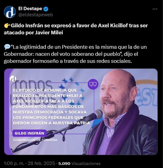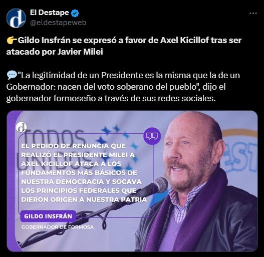 «El pedido de renuncia que realizó el Presidente Milei al Gobernador de la Provincia de Buenos Aires, Axel Kicillof, ataca a los fundamentos más básicos de nuestra democracia y socava los principios federales que dieron origen a nuestra Patria», agregó el mandatario de Formosa, y cerró: «Exigimos madurez política, respeto institucional y humildad como servidores públicos. El interés general del pueblo argentino está por encima de cualquier egoísmo o interés personal».