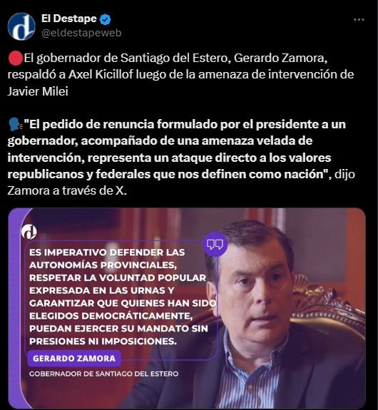 En tanto, Zamora afirmó: «Es fundamental para nuestro país, que como hombres de la democracia, rechacemos cualquier intento de socavar la autonomía de las provincias y la institucionalidad que establece la Constitución Nacional. El pedido de renuncia formulado por el presidente a un gobernador, acompañado de una amenaza velada de intervención, representa un ataque directo a los valores republicanos y federales que nos definen como nación.