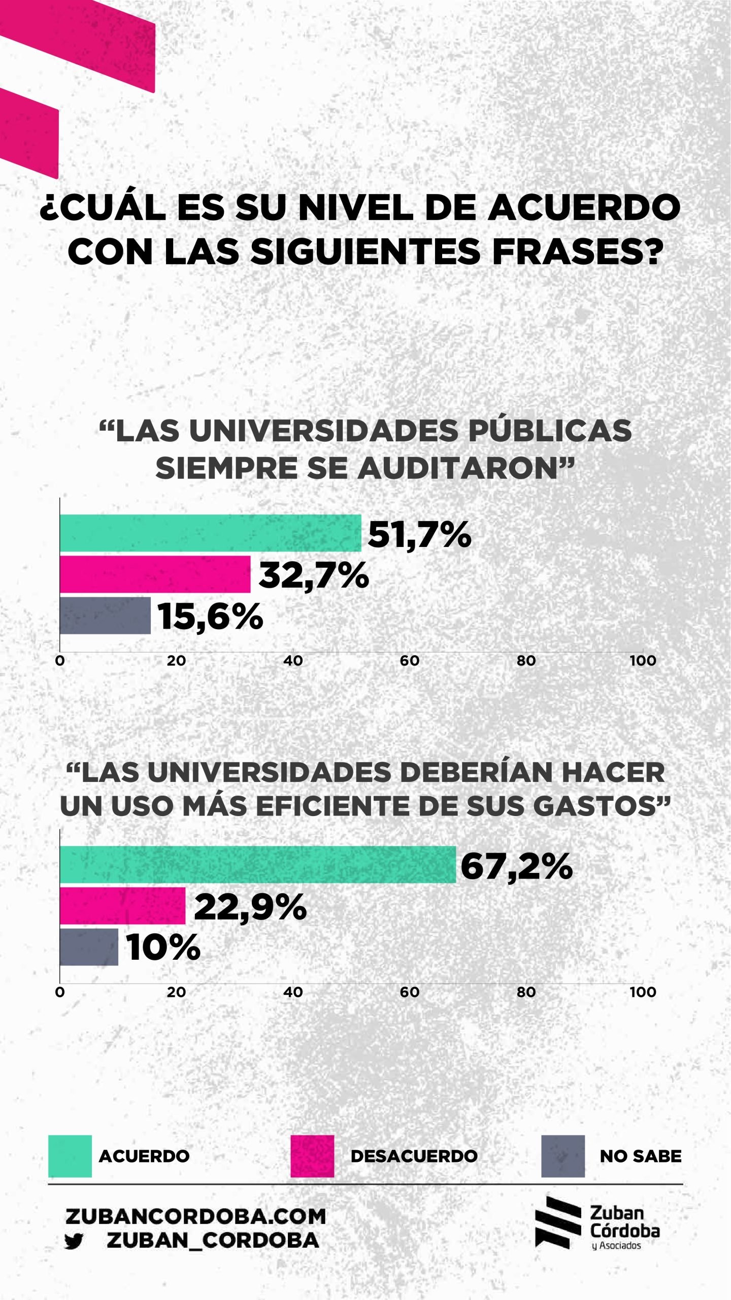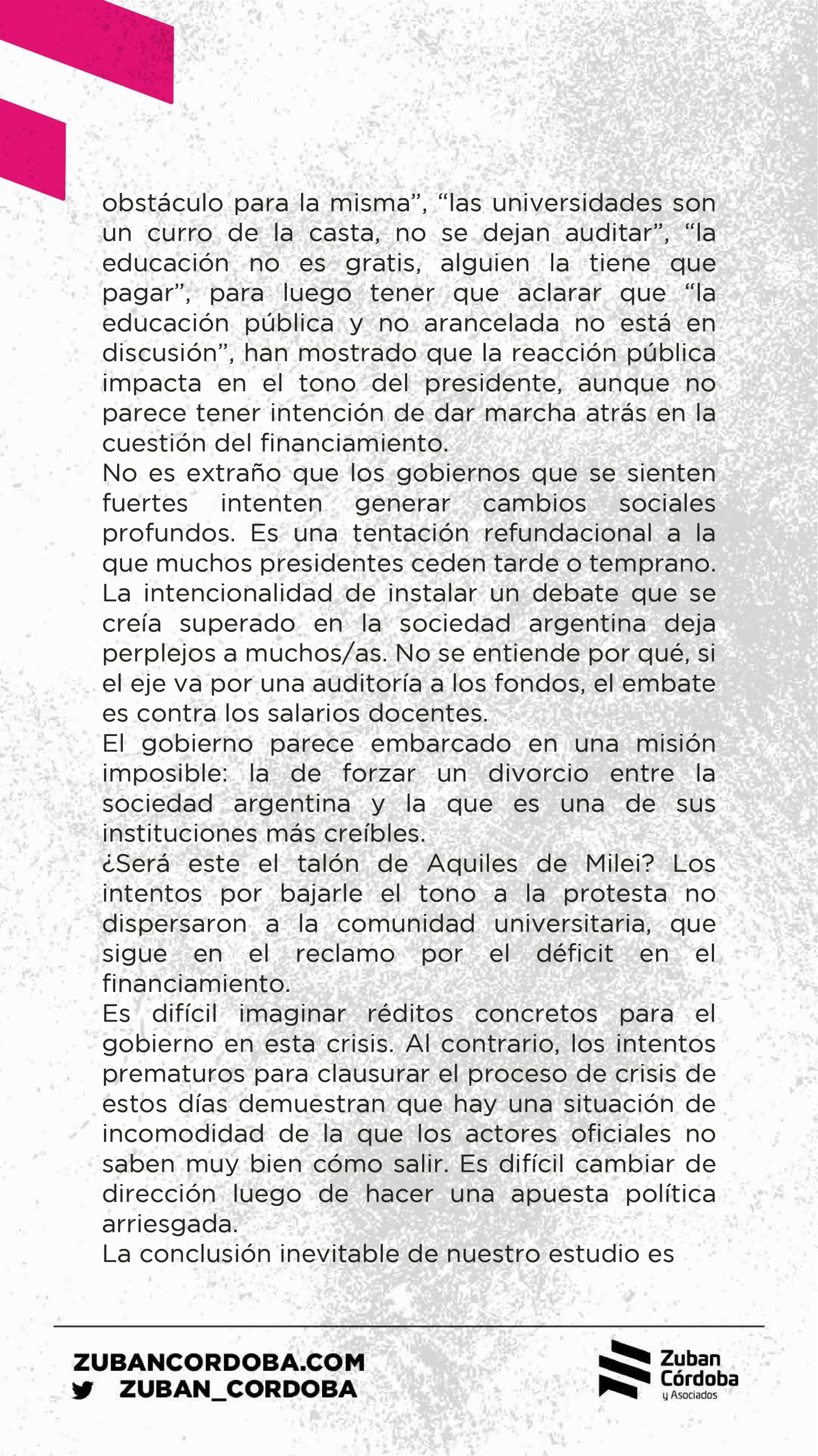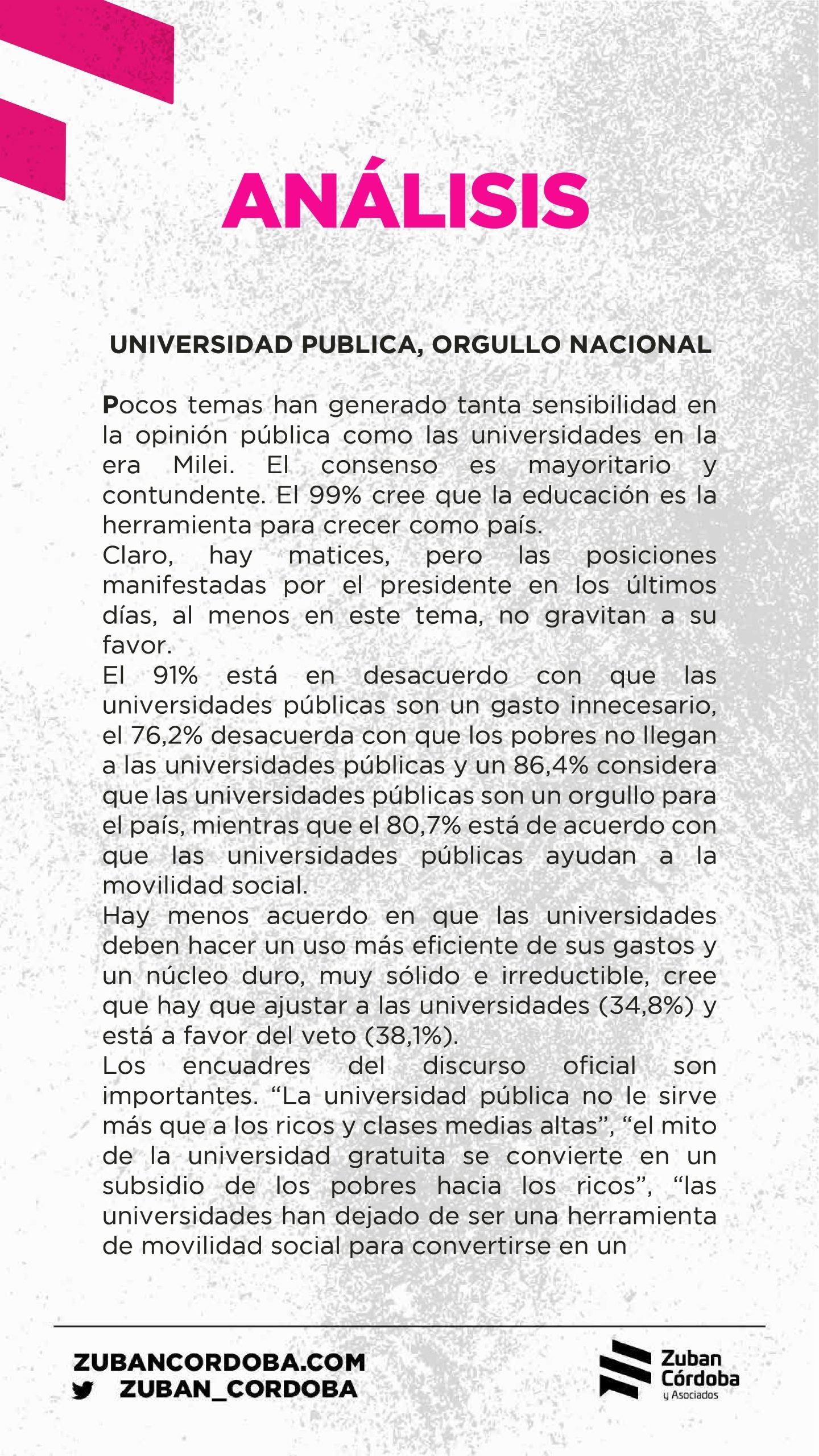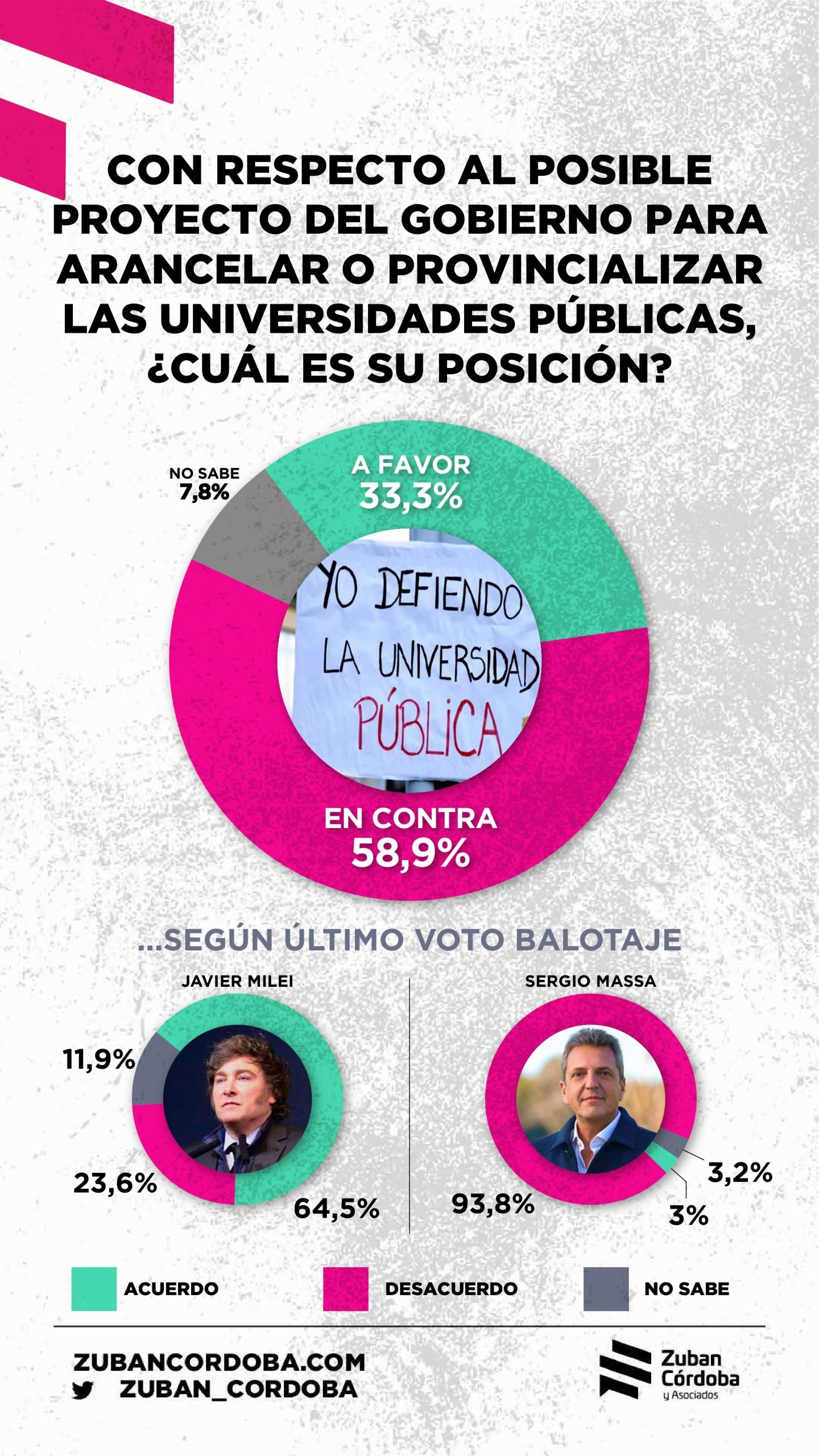 Los directores de la encuestadora, Gustavo Córdoba y Paola Zuban, se preguntan si el tema universidades será el talón de Aquiles de Milei. «Los intentos por bajarle el tono a la protesta no dispersaron a la comunidad universitaria, que sigue en el reclamo por el déficit en el financiamiento», dicen en el informe.