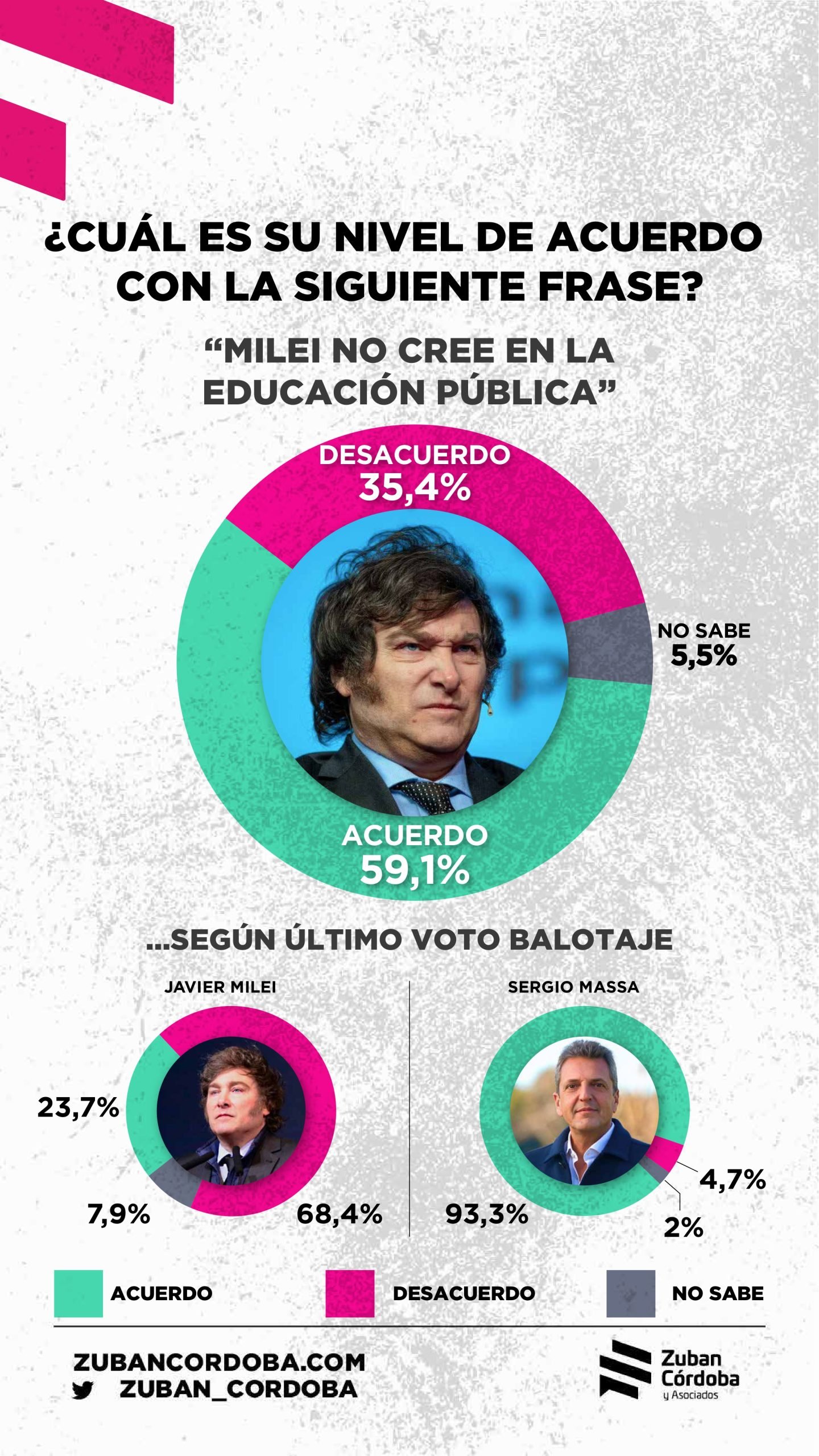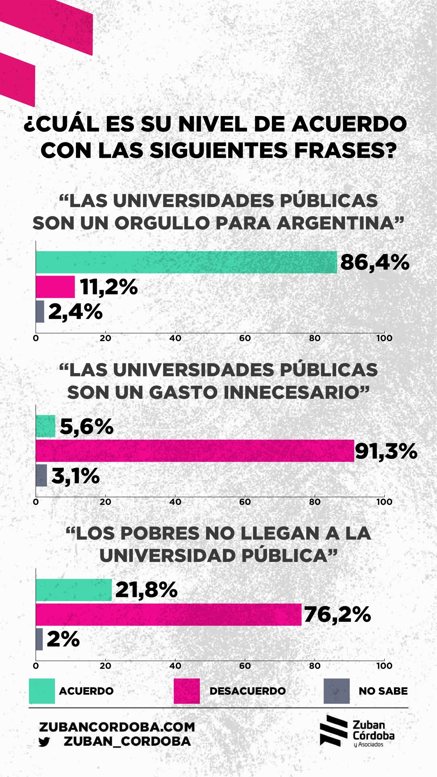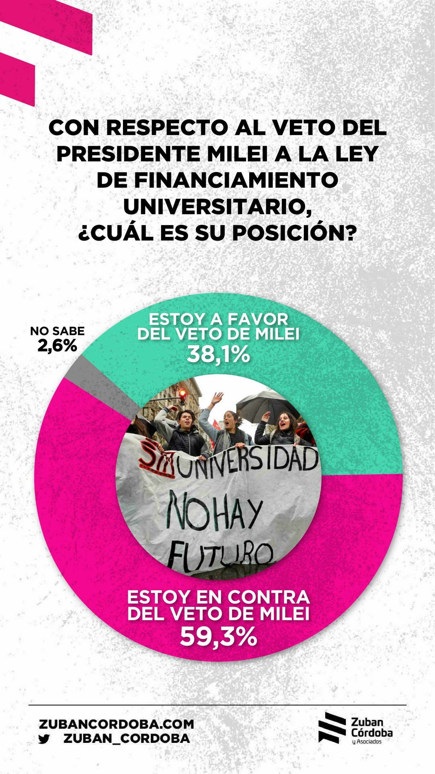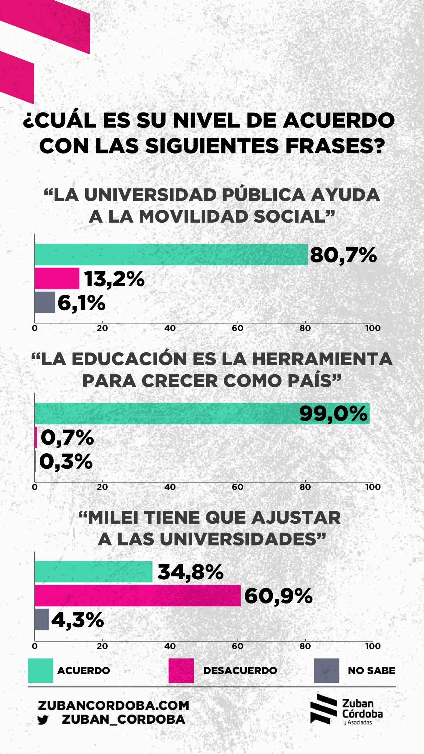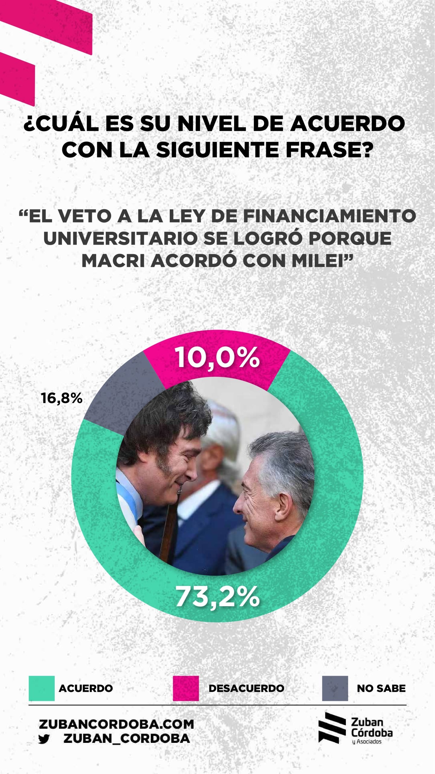 La encuesta también midió el impacto del veto a las universidades, que arroja números malos para Milei. El 91% está en desacuerdo con que las universidades públicas son un gasto innecesario y el 60,9% rechaza el ajuste a las universidades. El 73,2% cree que el veto se logró porque Milei acordó con Macri.