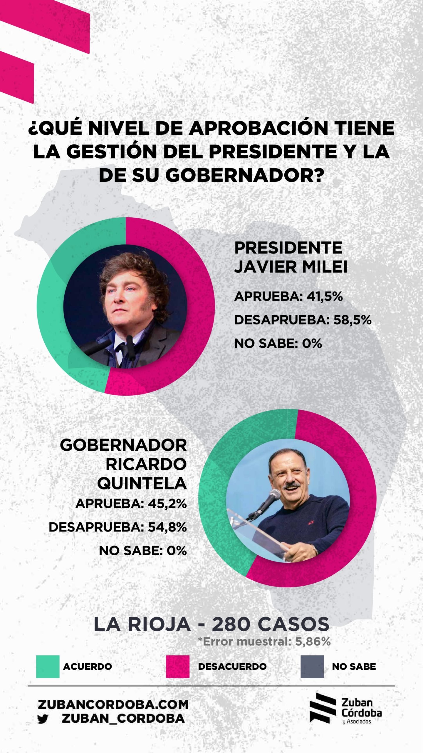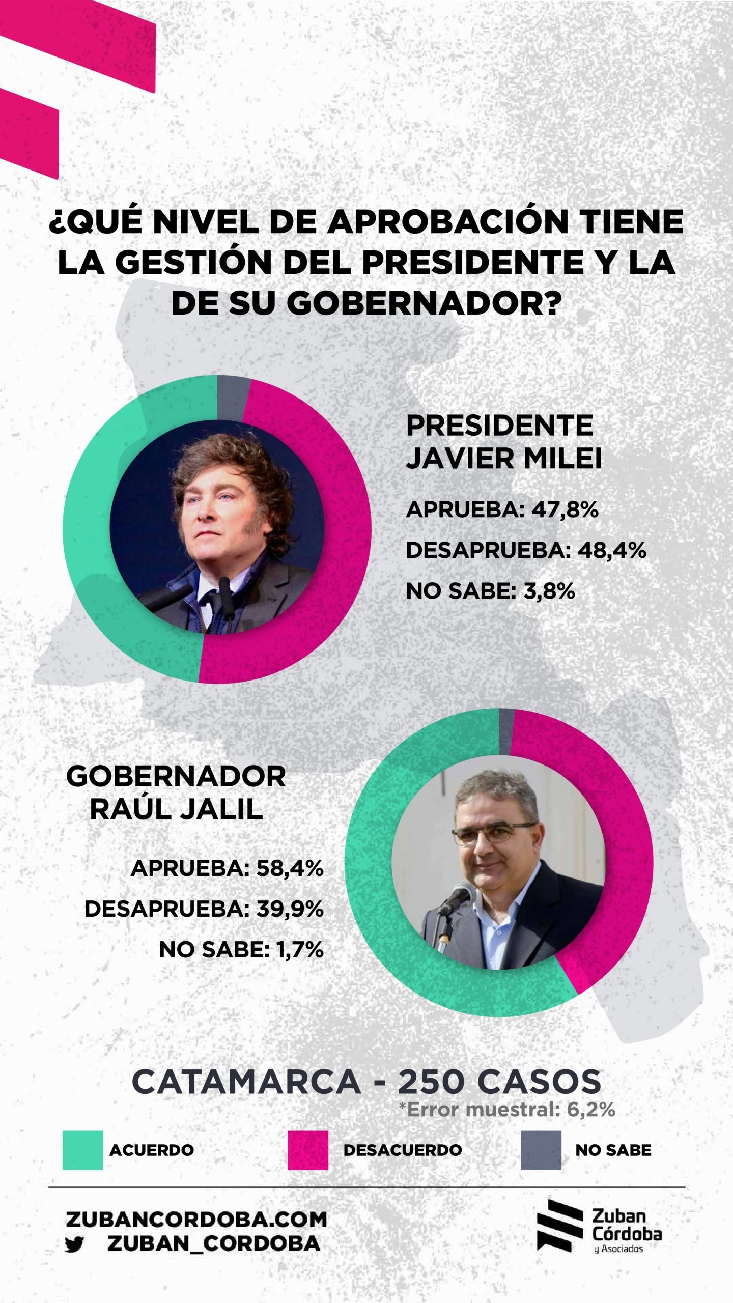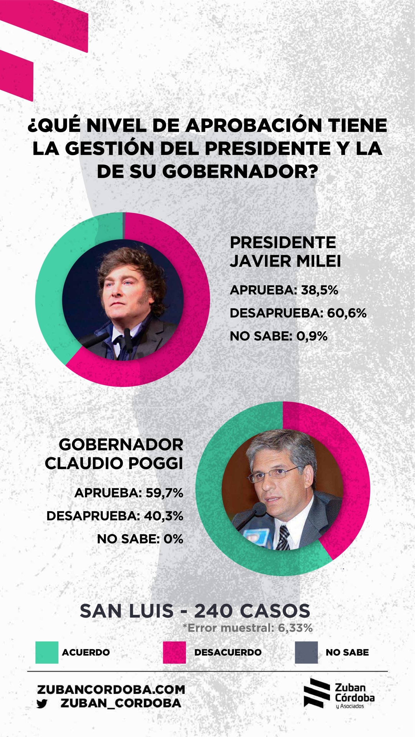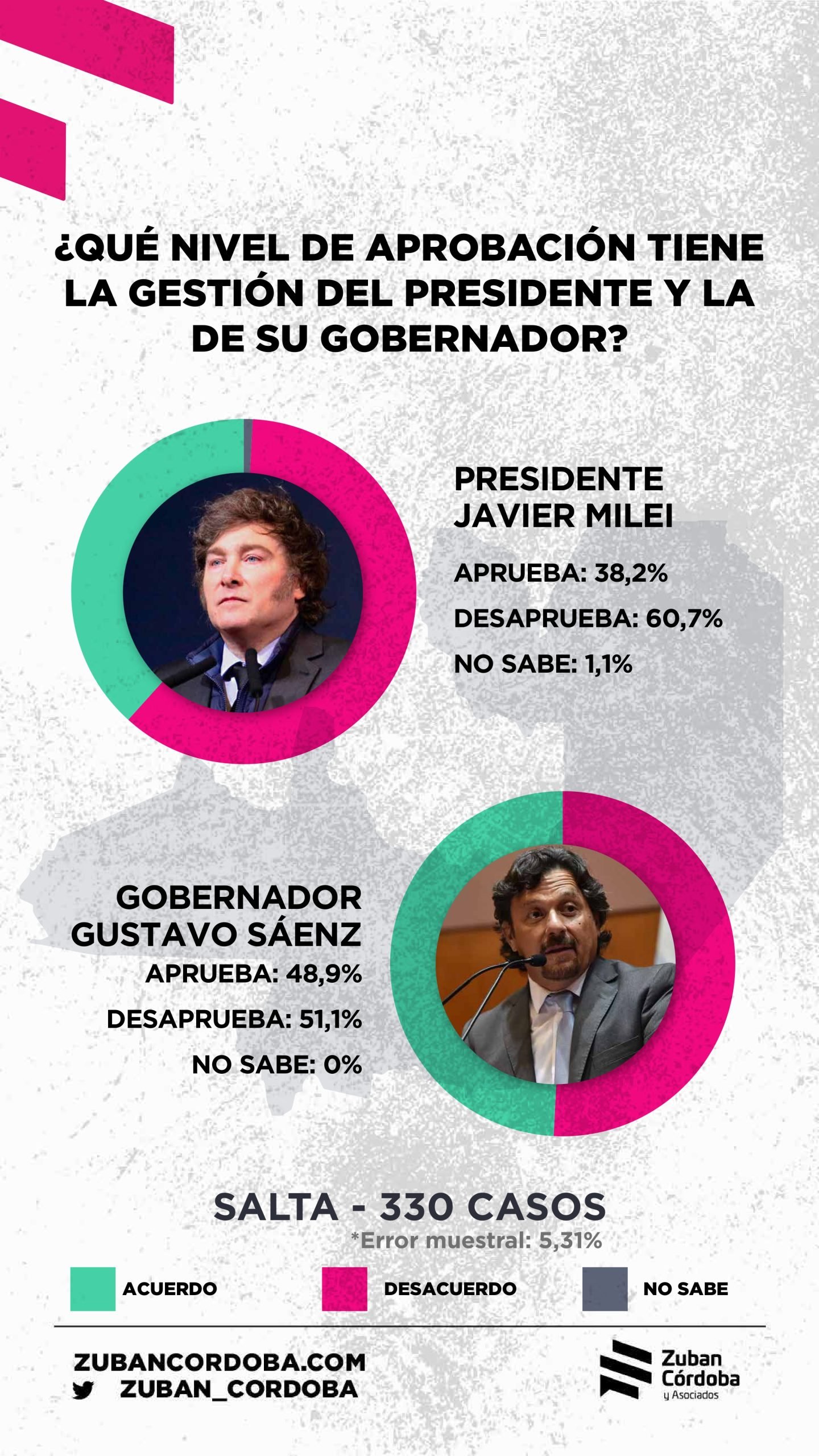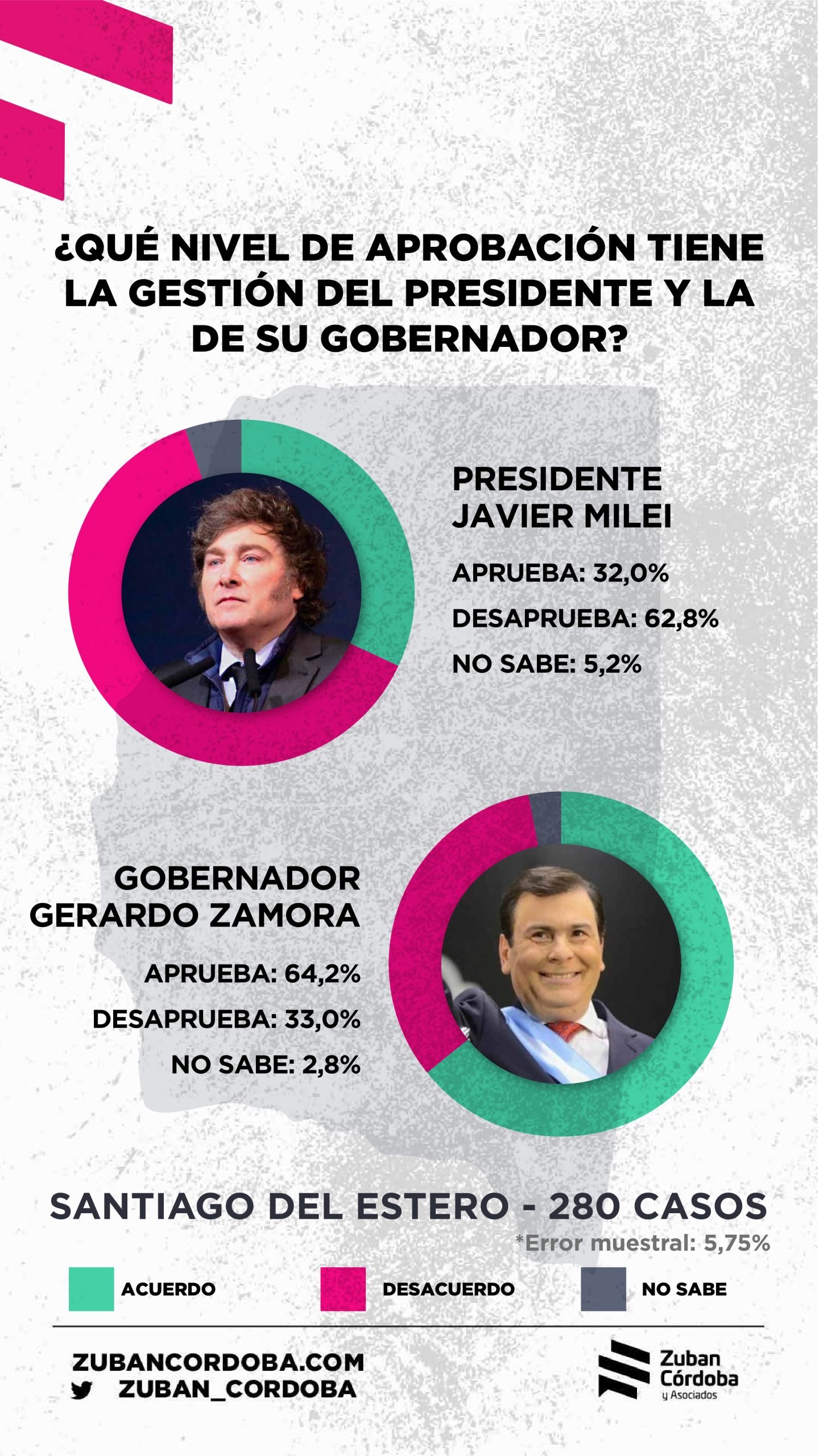 Hay casos resonantes como el de la Ciudad, en donde Milei tiene el 63,3% de desaprobación, o la provincia de Buenos Aires, donde tiene 60% de imagen negativa. En algunas provincias la diferencia entre el mandatario local y el libertario es feroz: en Santiago del Estero, por ejemplo, el gobernador Gerardo Zamora tiene una aprobación del 64,2% y Milei sólo del 32%.