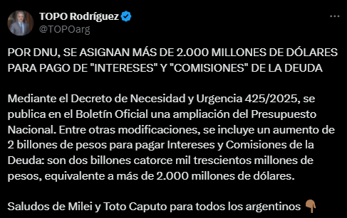 Así lo hizo el martes cuando publicó en Boletín Oficial el decreto 425/25 que, en nombre de la “emergencia económica, financiera, fiscal, administrativa, previsional, sanitaria y social” que le confiere el DNU 70/2023, reasigna partidas presupuestarias.
