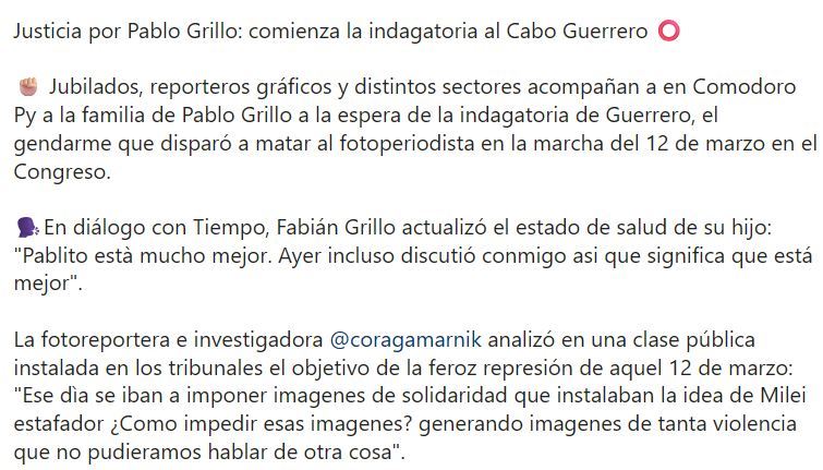 Acaso el mejor homenaje a Pablo, se lo hicieron sus colegas al documentar tanto la entrada como la salida del gendarme que respondía a las órdenes impartidas por la ministra de Seguridad, Patricia Bullrich, a cargo del operativo represivo del 12 de marzo pasado. “El pueblo ya esclareció lo que sucedió. Lo hizo mucho antes que la Justicia”, dice Fabián Grillo, el papá de Pablo, y agradece el acompañamiento que tiene desde que su hijo quedó internado después de recibir el disparo.
