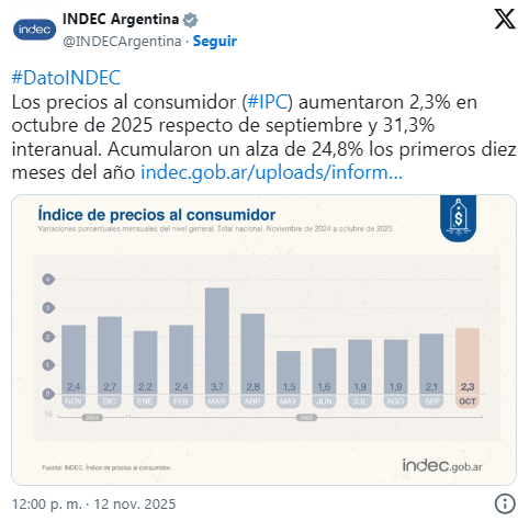 El Instituto Nacional de Estadística y Censos (Indec) difundió la variación de precios correspondiente al mes pasado. La inflación fue del 2,3% y acumuló un alza del 31,3% en los últimos doce meses.