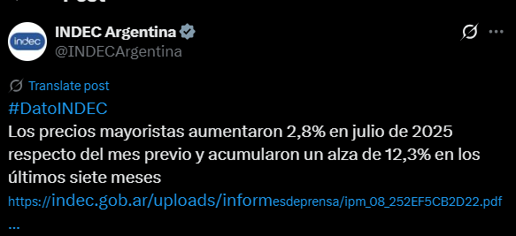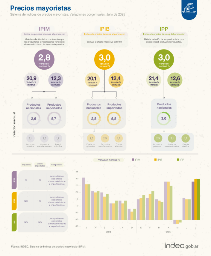 Peligra la desaceleración de la inflación. El nivel general del Índice de Precios Internos al por Mayor (IPIM) registró un aumento de 2,8% en julio de 2025 respecto del mes anterior, como consecuencia de una suba de 2,6% en los “Productos nacionales” y del 5,7% en los “Productos importados”, informó este martes el Instituto Nacional de Estadística y Censos (INDEC).