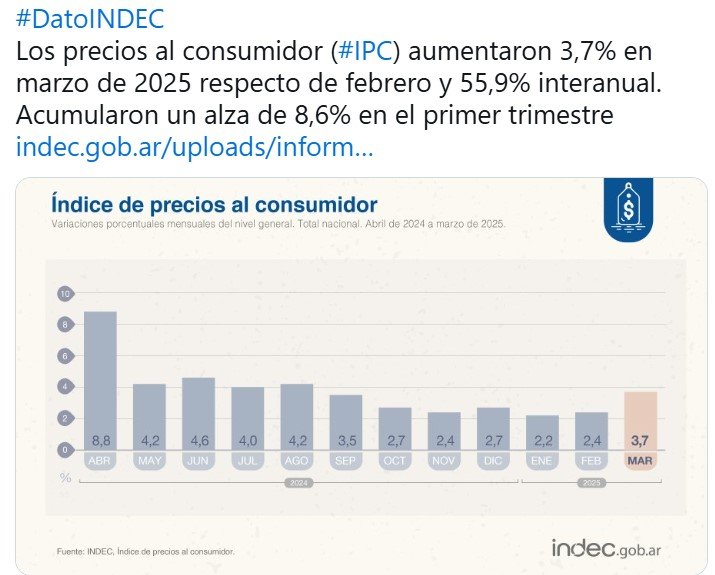 La inflación se volvió a disparar en marzo, en medio de rumores sobre una inminente devaluación del peso con respecto al dólar. El Índice de Precios al Consumidor (IPC) que mide el Instituto Nacional de Estadística y Censos (INDEC) tuvo una aceleración del 3,7 por ciento, en el mes de marzo.