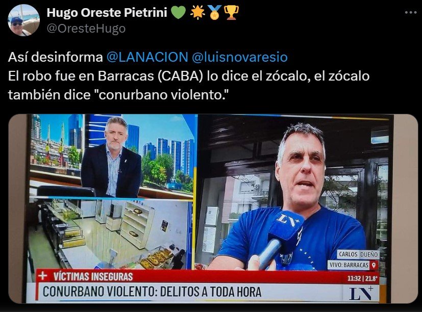 «Fue un robo violento para ser una panadería pero más allá de esos empujones no pasó de eso», narró Carlos, el dueño de la panadería «El Viejo Sanzo». Mientras comentaba los pormenores del hecho, el zócalo del noticiero alertaba por el «conurbano violento», con sus «delitos a toda hora» y advertía por las «víctimas inseguras». «Tuvimos robos menores, pero que ni siquiera se llevaron a cabo. Esta es la primera vez que se llevan efectivos y algunas notebooks. Sobre todo por la violencia y el calibre de las armas, para una panadería, es mucho», agregó el dueño, al mismo tiempo que el videograph mantenía en el título la confusa consigna sobre presunta inseguridad en el distrito bonaerense, gobernado por Axel Kicillof, cuando en realidad había ocurrido en el distrito del jefe de Gobierno porteño, Jorge Macri.