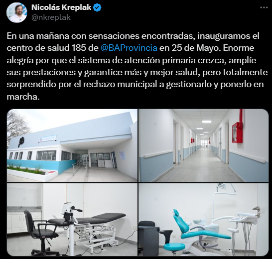 «En una mañana con sensaciones encontradas, inauguramos el Centro de Salud 185 –comenzó declarando el ministro de Salud bonaerense, Nicolás Kreplak–. Enorme alegría por que el sistema de atención primaria crezca, amplíe sus prestaciones y garantice más y mejor salud, pero totalmente sorprendido por el rechazo municipal a gestionarlo y ponerlo en marcha».