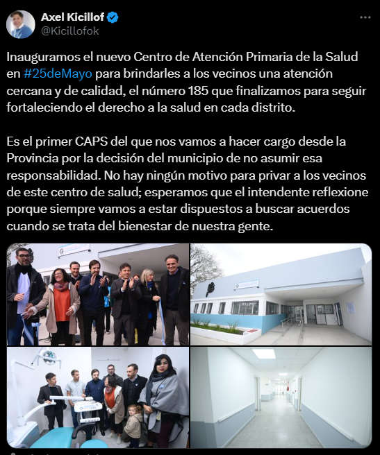 El funcionario aclaró que el CAPS pasará, al menos en el primero momento, a ser manejado por el propio Gobierno de la Provincia: «no nos quedamos de brazos cruzados. Las y los vecinos de 25 de Mayo no lo merecen y tampoco tienen la culpa de una pésima decisión de gestión. Este centro de salud inicialmente no será de gestión municipal, pero la Provincia garantizará la atención y su funcionamiento«.