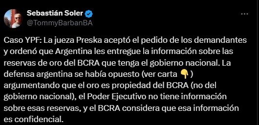 Mientras tanto, los fondos buscan cobrar de forma anticipada la indemnización. Como demandantes pueden solicitar información sobre bienes del demandado, de modo que se puedan identificar los bienes embargables. Así, obtendrán los datos sobre los lingotes de oro que salieron de la bóveda del Banco Central el año pasado y que el Ejecutivo de Milei se negó a explicar a la opinión pública argentina ante reiterados pedidos de información.