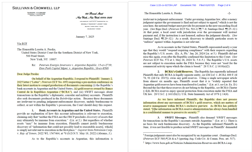 En el fallo de Preska se incluyeron observaciones sobre la integridad de los documentos entregados por Argentina hasta el momento. Es que los papeles solicitados están relacionados con activos estratégicos del país, que generan un alto interés internacional. Los fondos piden que el país entregue información para comprobar que ciertas entidades manejadas por Argentina son extensiones del Estado y que pueden ser parte de la ejecución de la sentencia. El caso por la nacionalización de YPF es considerado una de las disputas más relevantes entre un Estado soberano y acreedores internacionales.