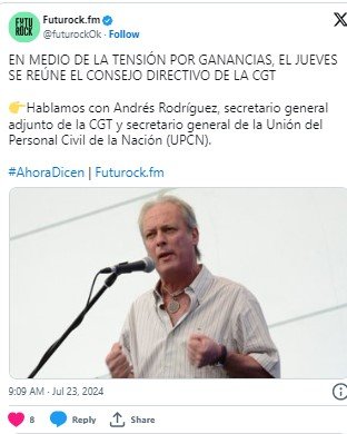 Rodríguez anticipó los argumentos que seguro se repetirán en el consejo directivo de este jueves. «Todos estamos en contra de un montón de realidades que genera el gobierno en materia laboral», aseguró, pero que lo que se debatía era cuál era la mejor estrategia para neutralizarlo. Para Rodríguez es el diálogo, pese a que su gremio de estatales ya tuvo miles de despidos en lo que va del año y se anticipan muchos más. «Podremos ver si la negociación da resultado y, si no es así, iremos al conflicto», aseguró. Moyano había advertido que «no le voy a dar una mano a este Gobierno, hay que confrontarlo». En esos términos será la discusión interna en la central.