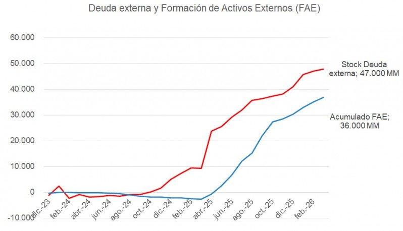 De acuerdo con datos actualizados a marzo de 2026, desde diciembre de 2023 ingresaron 47.000 millones de dólares netos en concepto de deuda externa, incluyendo desembolsos de organismos internacionales como el Fondo Monetario Internacional y préstamos financieros. En ese contexto, se mencionan también operaciones como la toma de 2.000 millones de dólares del Banco Mundial, además del incremento de 15.000 millones de dólares en la deuda con el FMI.