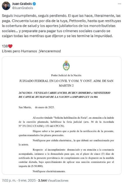 “Seguís incumpliendo, seguís perdiendo. El que las hace, literalmente, las paga. Cincuenta lucas por día de la tuya, Pettovello, hasta que restituyas la cobertura de salud y los aportes jubilatorios de los monotributistas sociales… y prepárate para pagar tus crímenes sociales cuando se caigan todas las mentiras que dijeron y se les termine la impunidad”, agregó Grabois.
