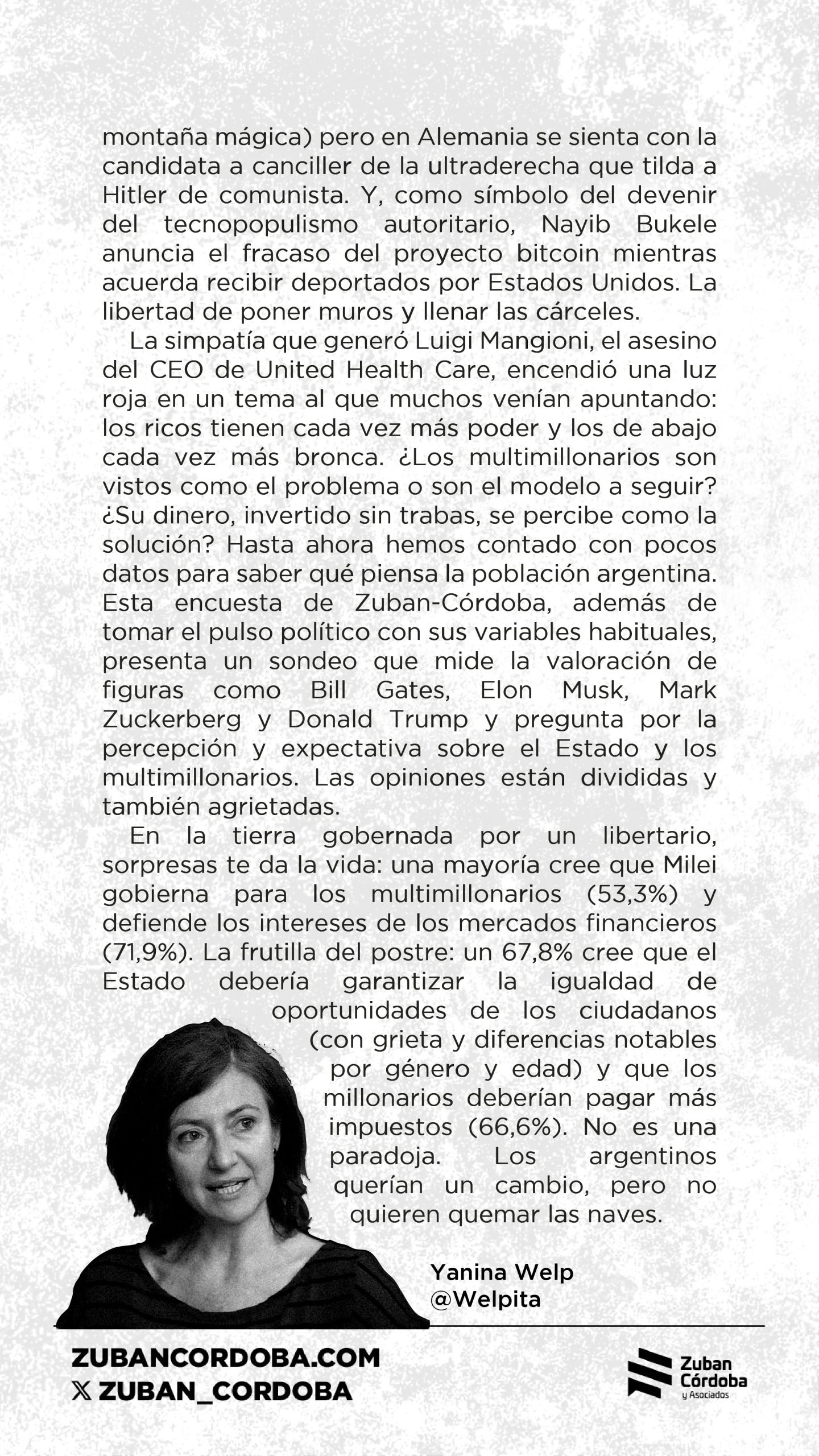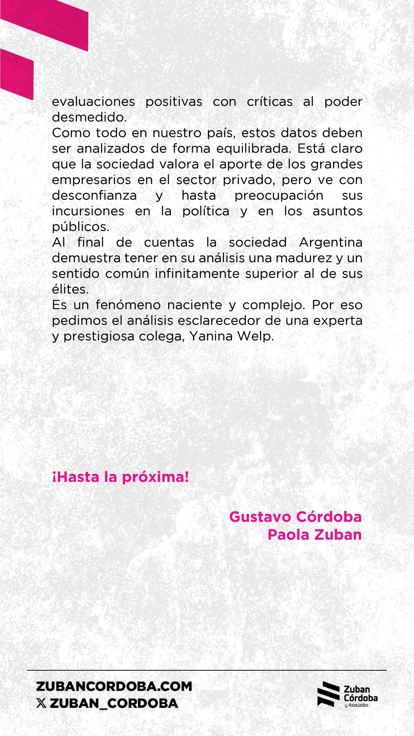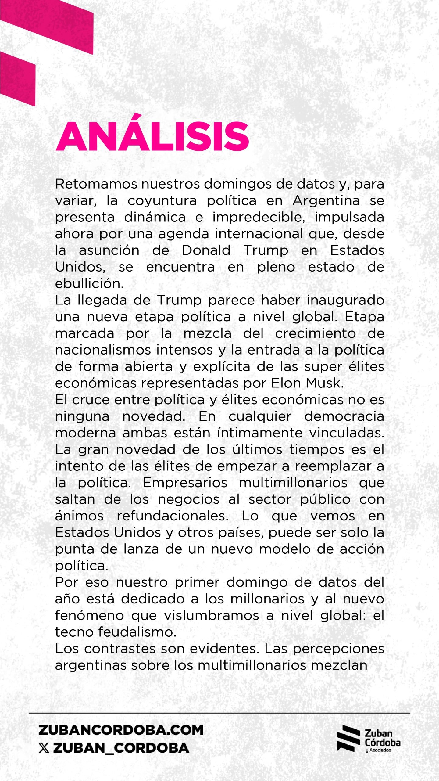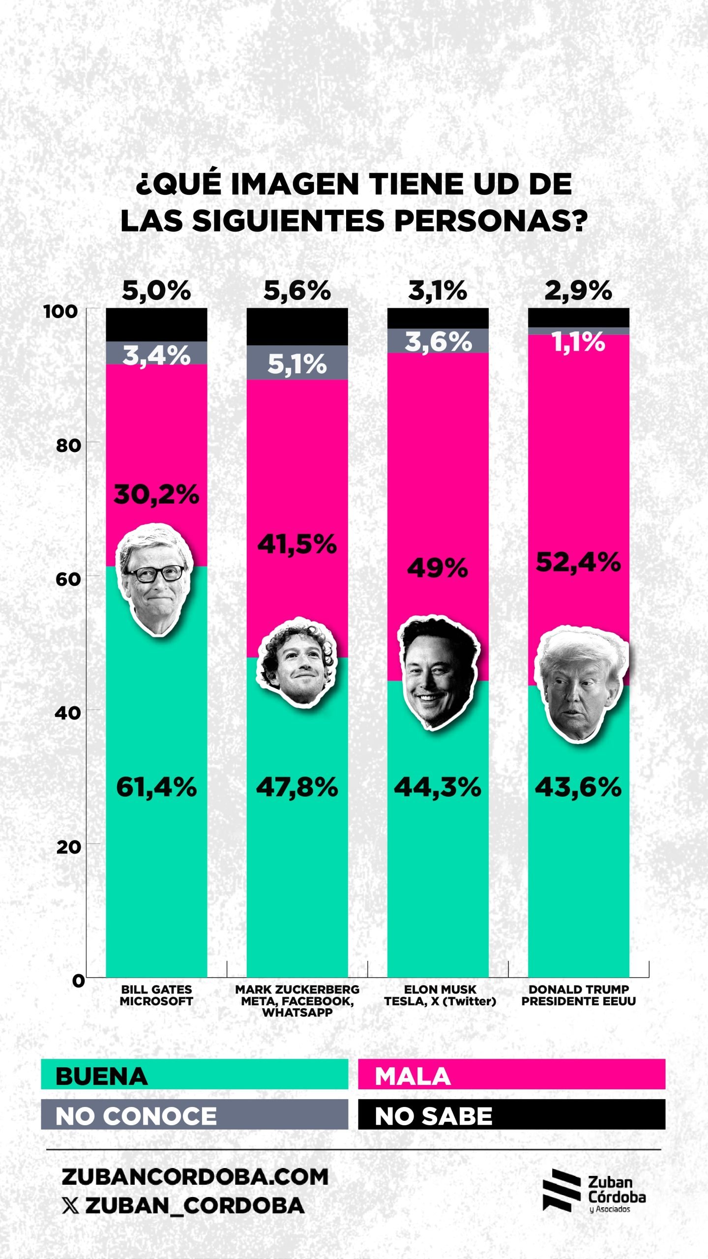 Por último, el relevamiento indaga sobre los multimillonarios y el llamado tecnofeudalismo. En ese sentido, un 61,4 por ciento tiene una opinión favorable del CEO de Microsoft, Bill Gates, siendo el mejor valorado de los encuestados. Luego lo sigue Mark Zuckerberg con 47,8 por ciento de imagen positiva, Elon Musk con más imagen negativa que positiva (49-44,3) y Donald Trump con 52,4 de rechazo y un 43,6 de apoyo.