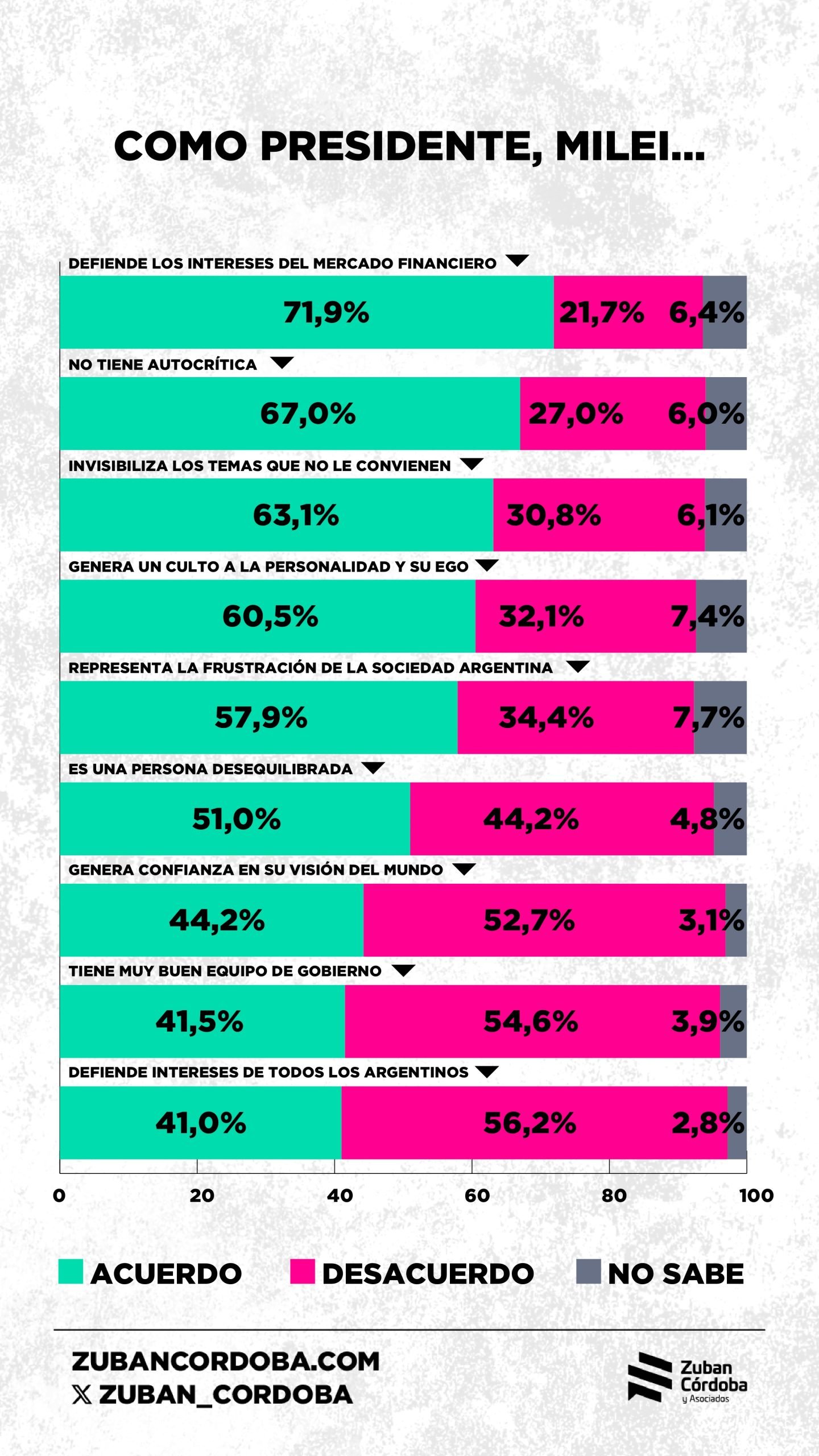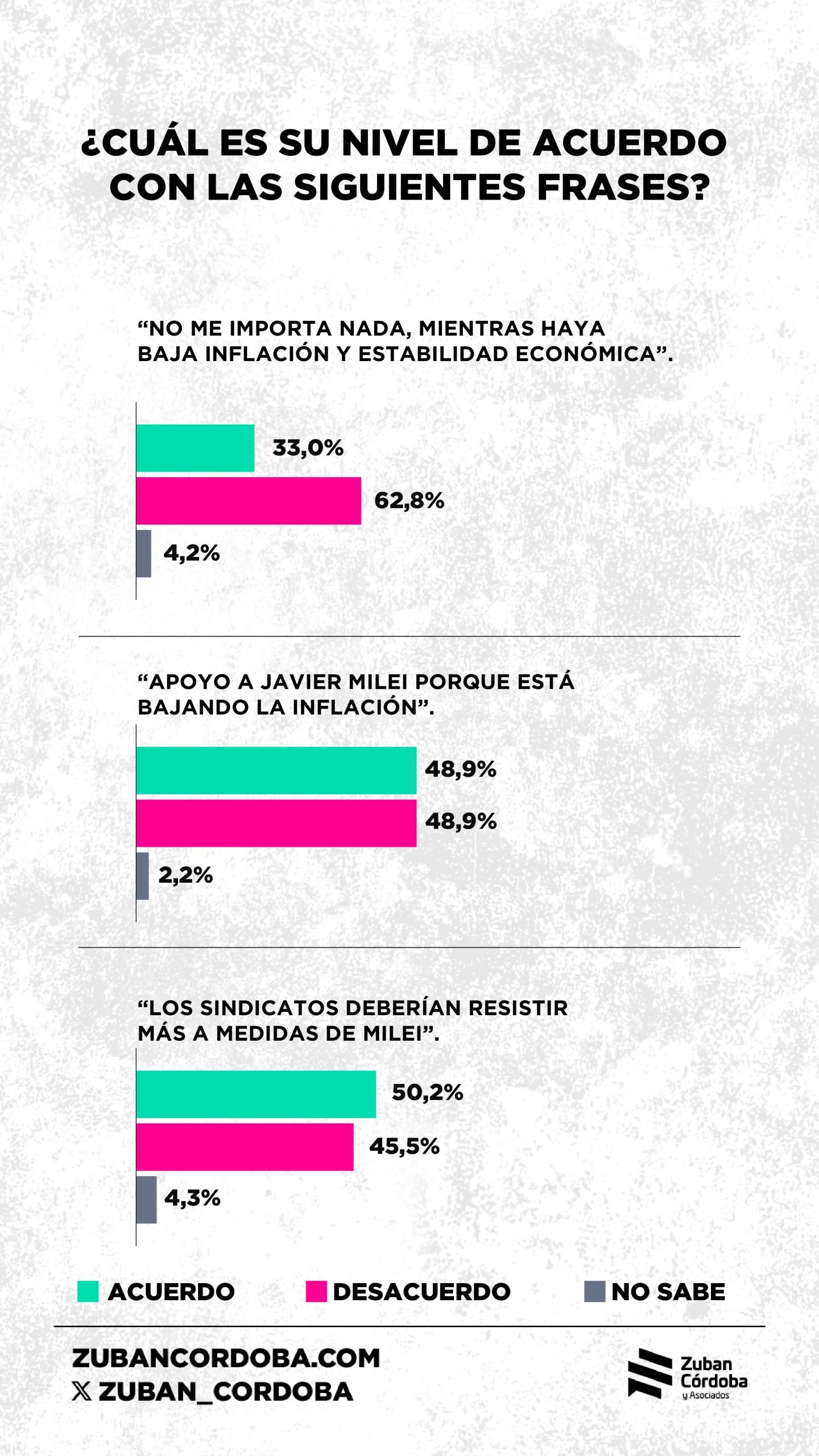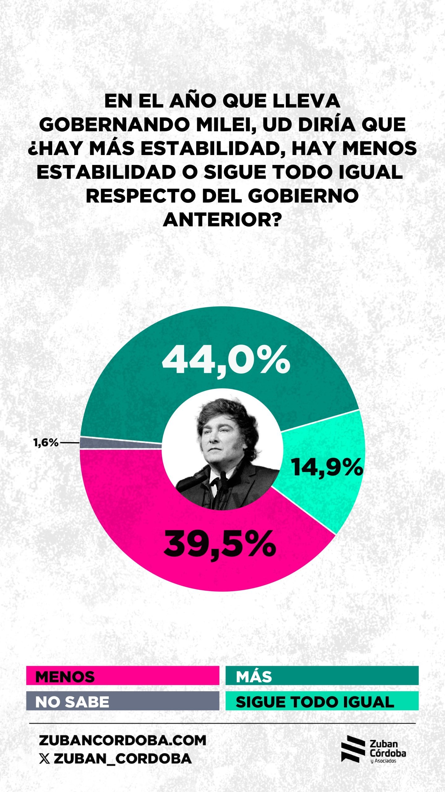 Zuban Córdoba pone el ojo en la estabilización inflacionaria como una cuestión positiva entre los ciudadanos pero los apoyos se mantienen polarizados con un empate en 48,9 por ciento entre los que dicen defender a Milei por este motivo.