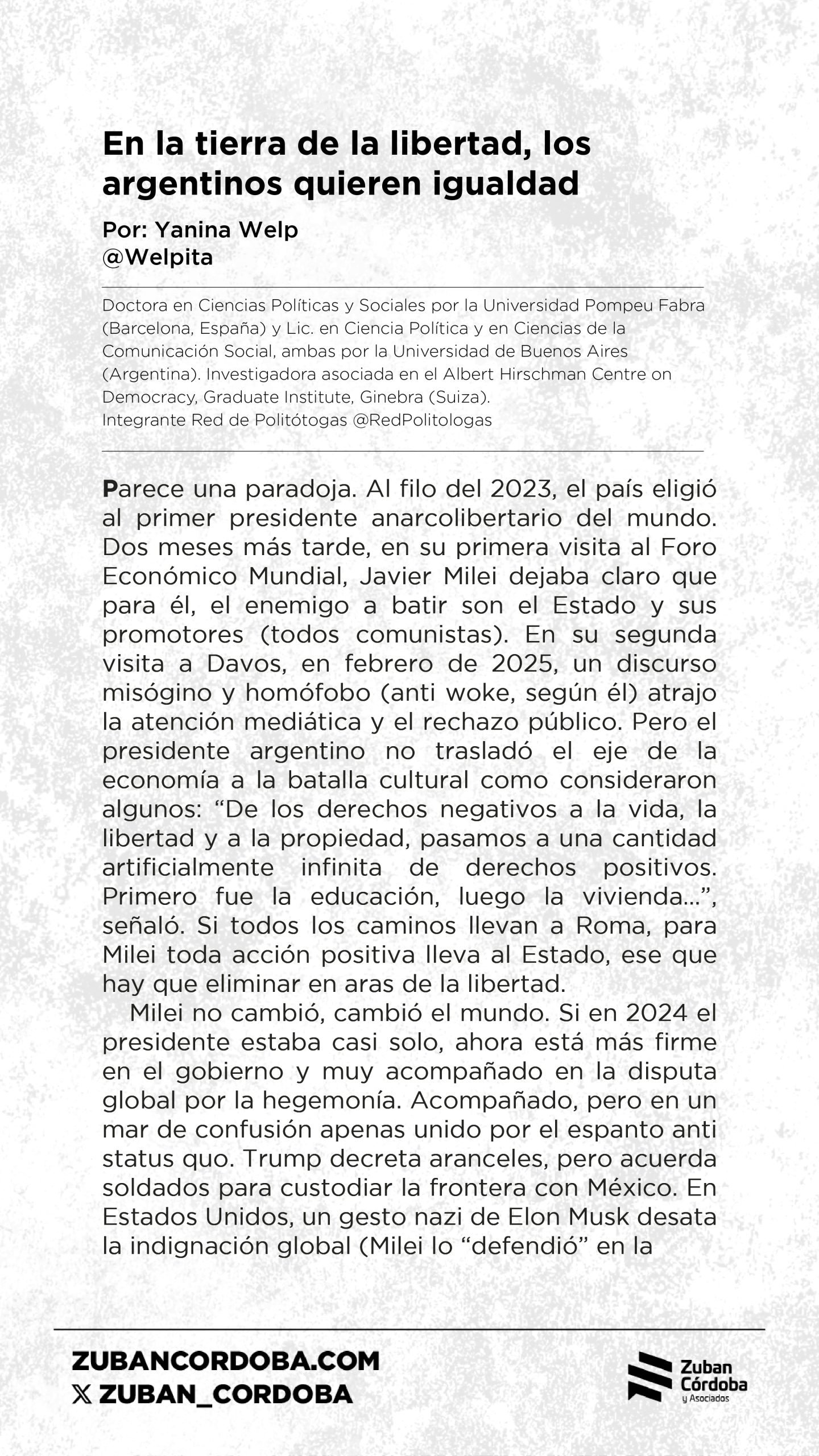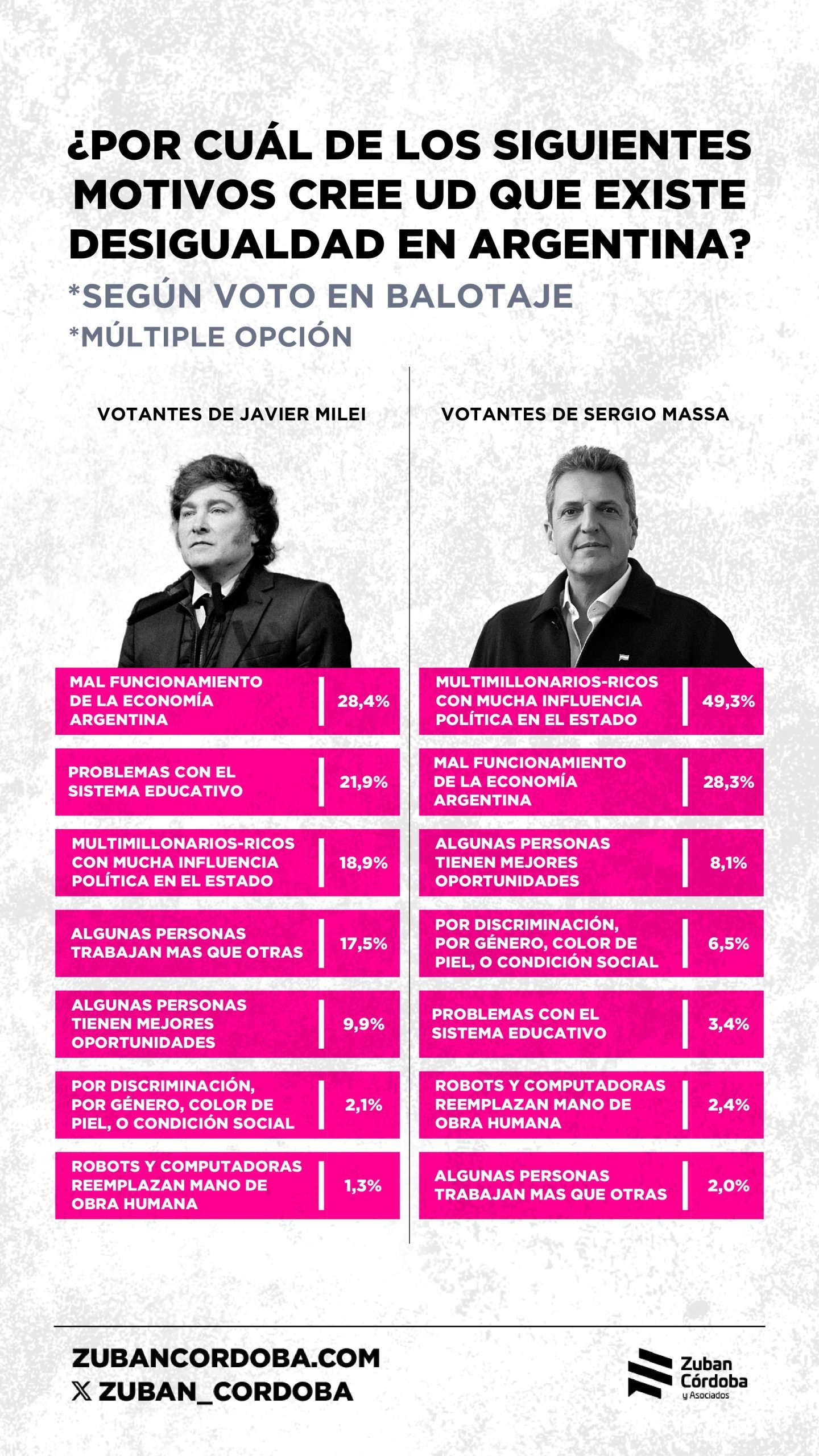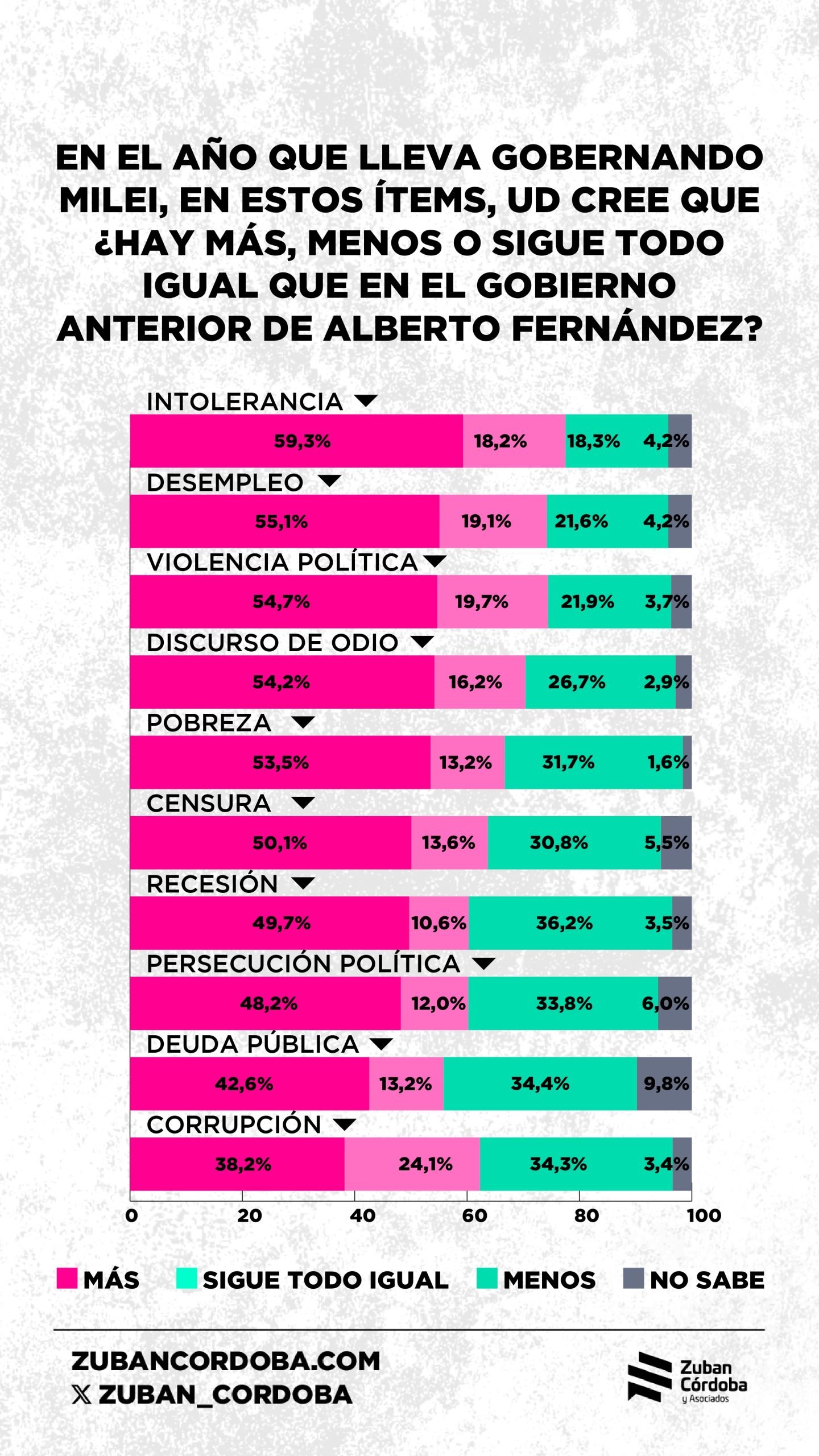 Zuban Córdoba pone el ojo en la estabilización inflacionaria como una cuestión positiva entre los ciudadanos pero los apoyos se mantienen polarizados con un empate en 48,9 por ciento entre los que dicen defender a Milei por este motivo.