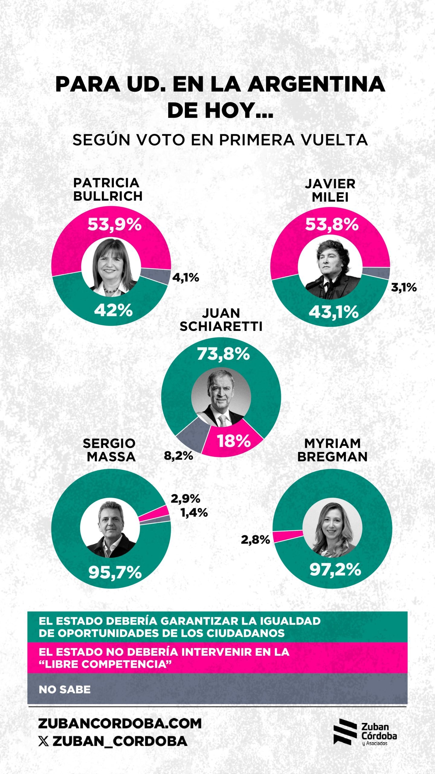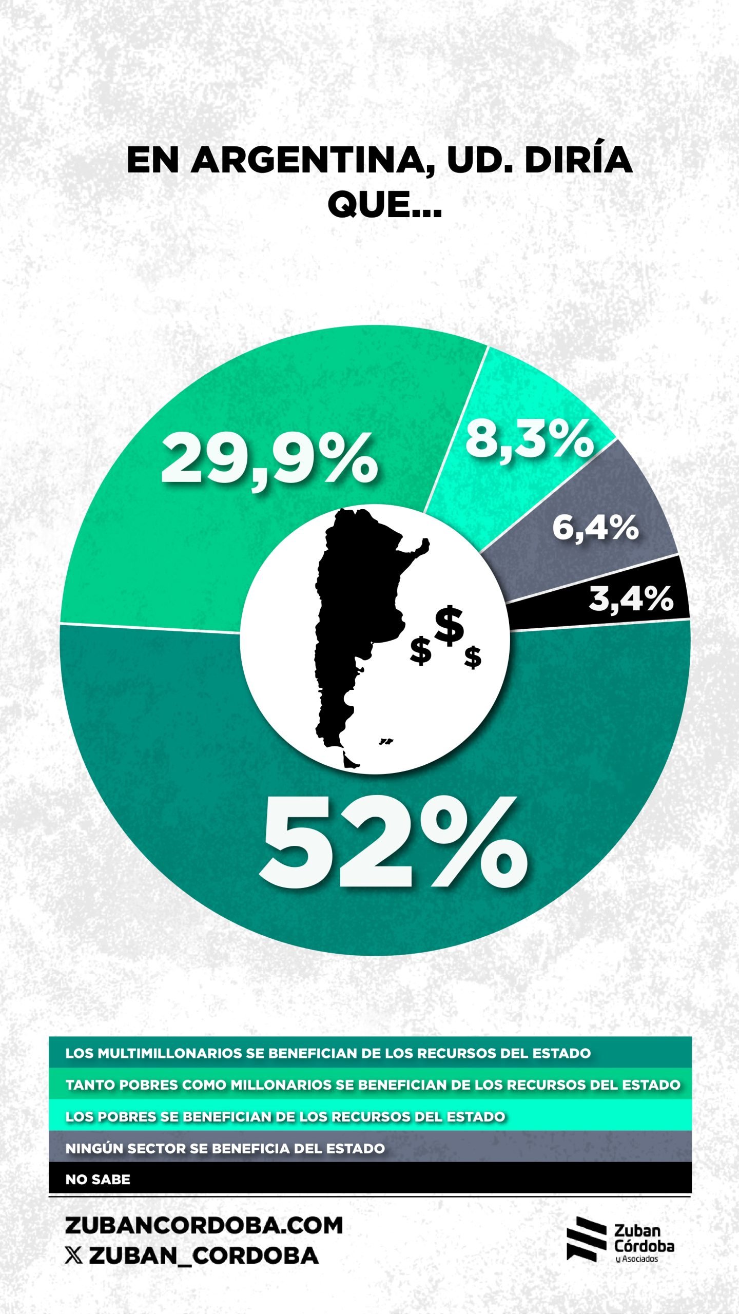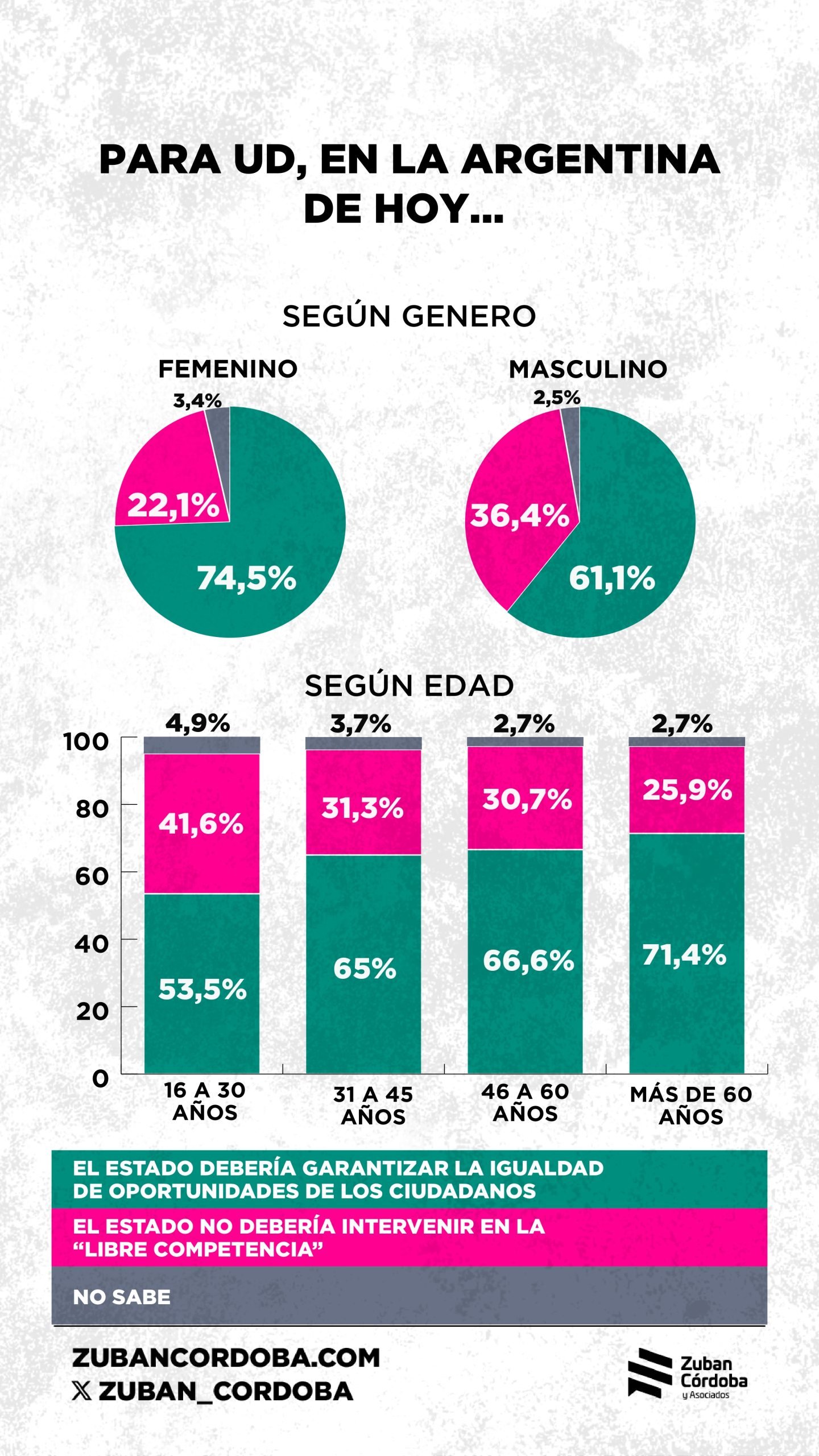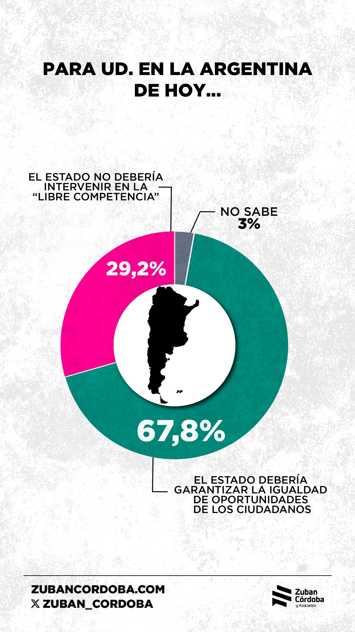 Otro dato que destaca la encuesta es que el 67,8 por ciento cree que el Estado debe garantizar las posibilidades entre todos los ciudadanos, a contramano del ideario libertario que repudia la idea de justicia social.