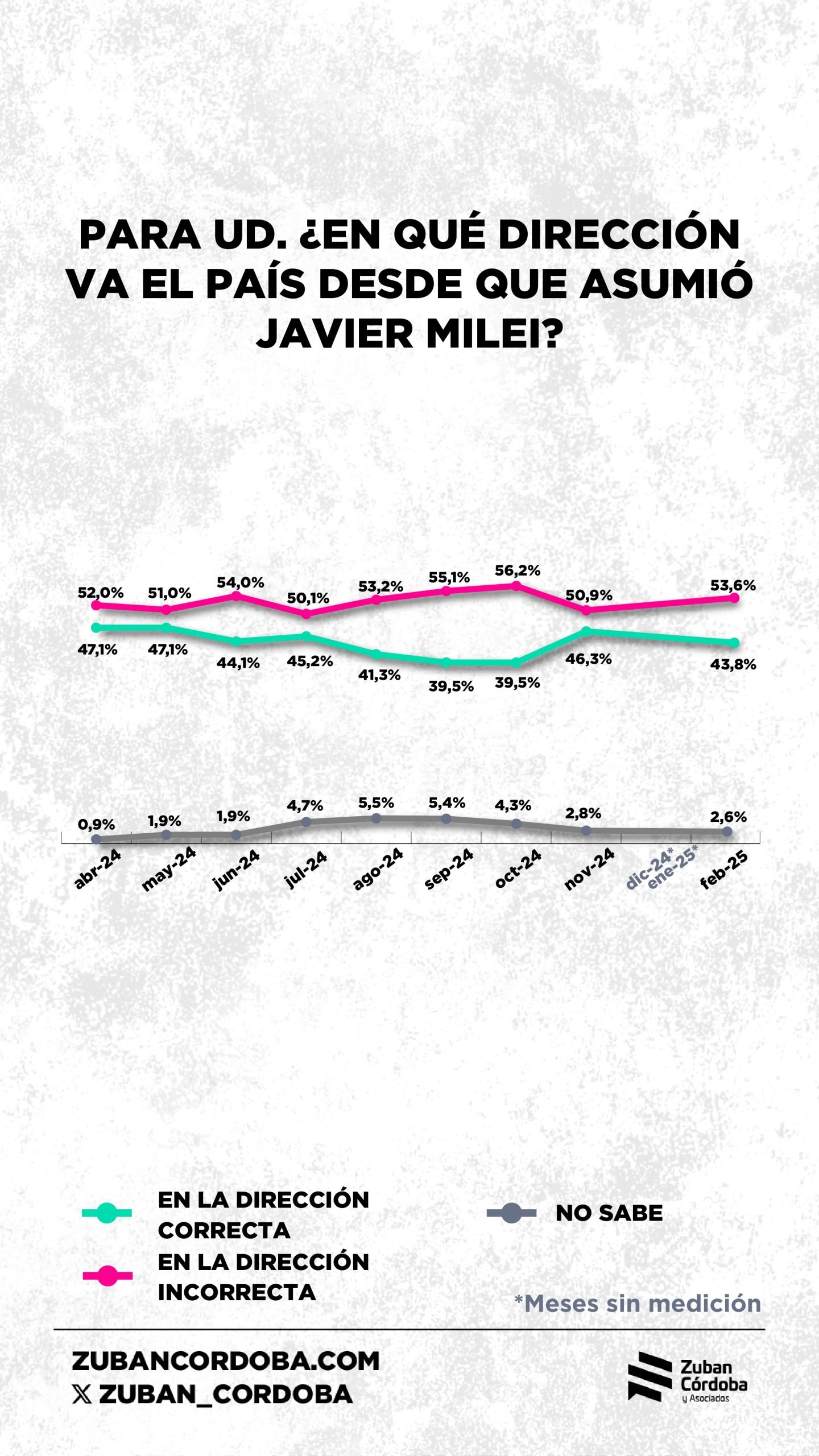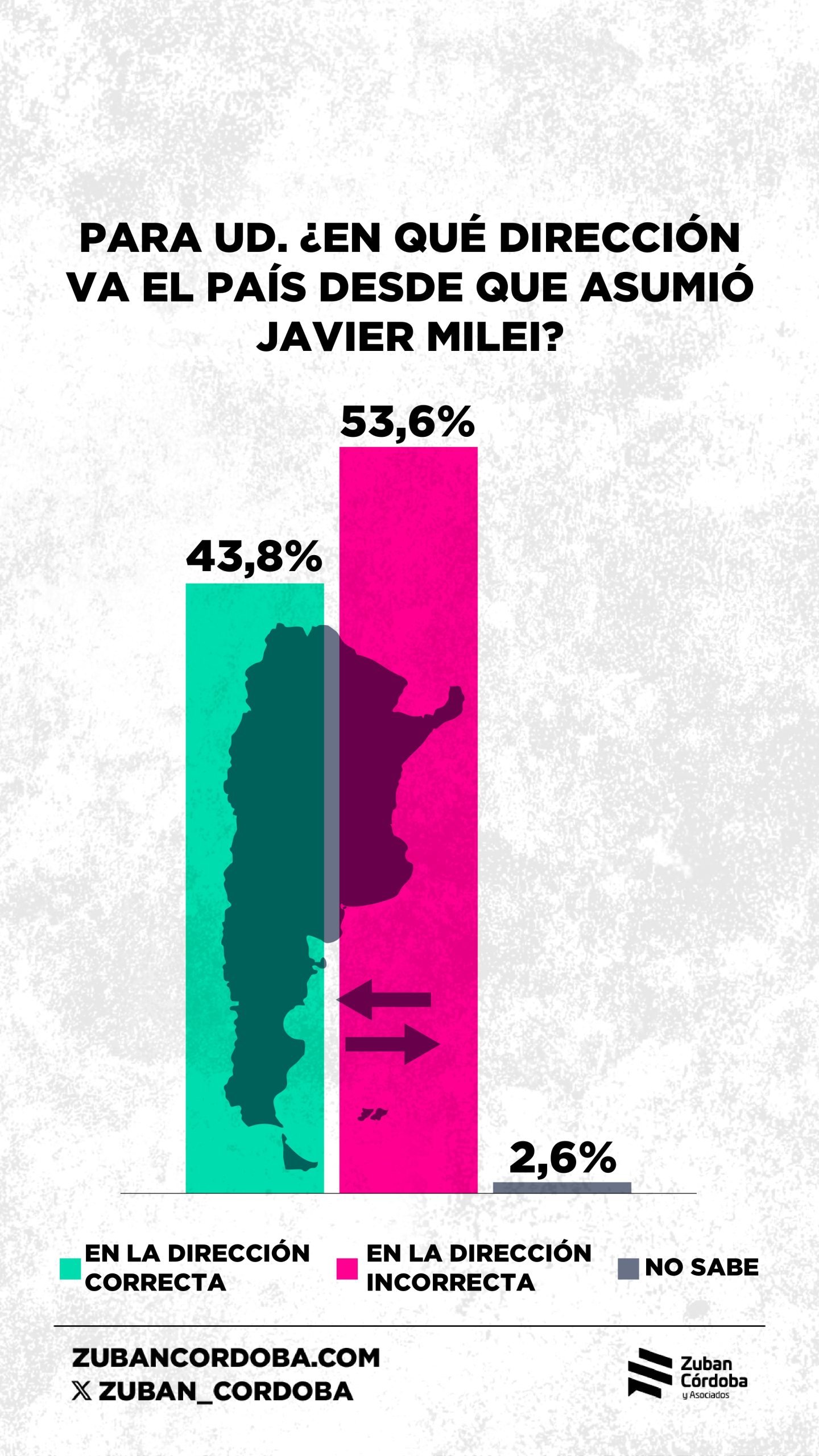 La encuesta destaca que un 53,6 por ciento de los consultados asegura que Milei lleva al país va por la dirección incorrecta contra un 43,9 que sostiene que estamos en la dirección correcta.