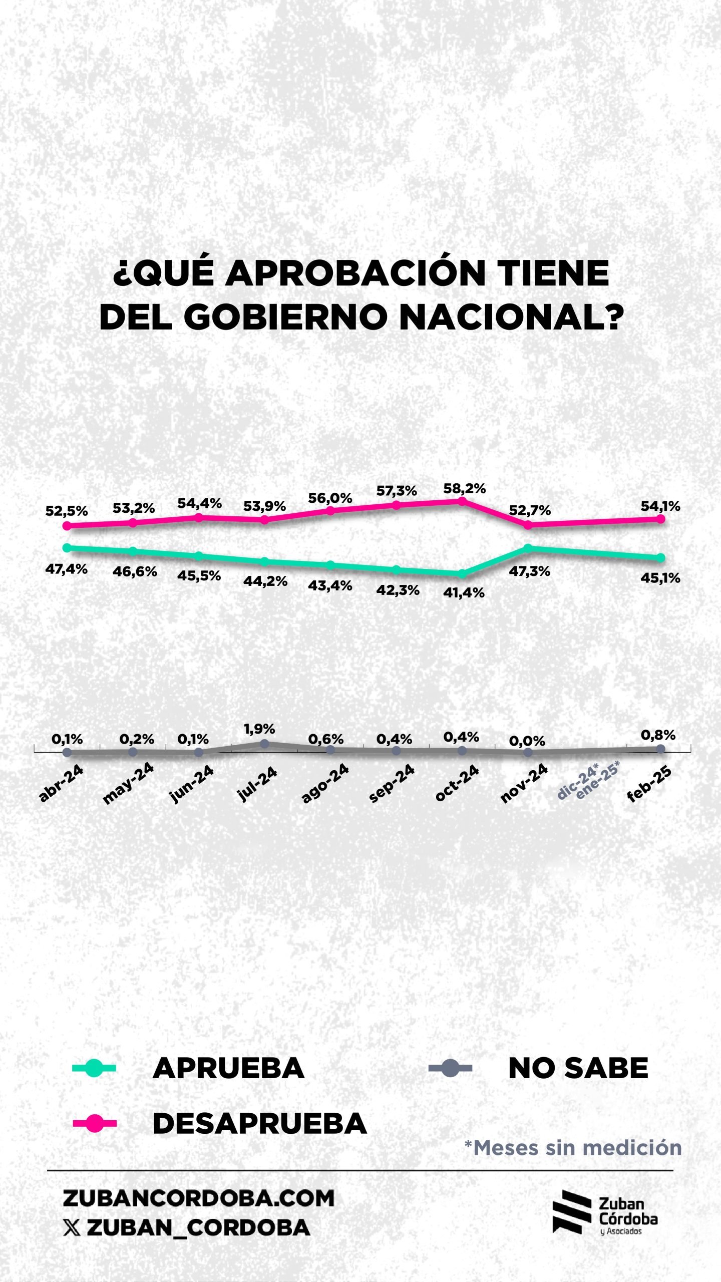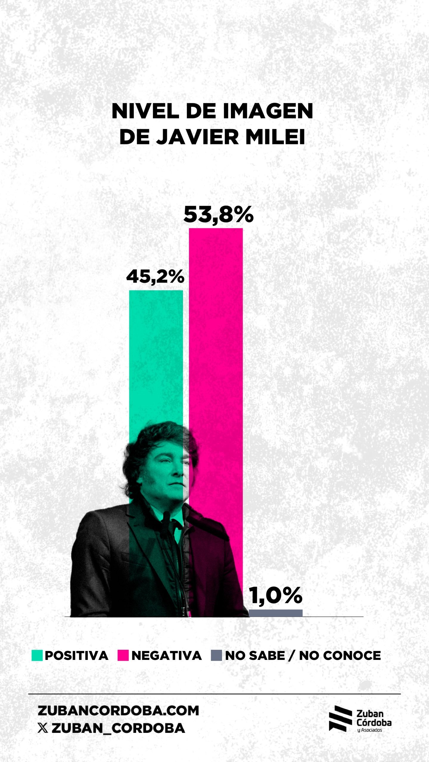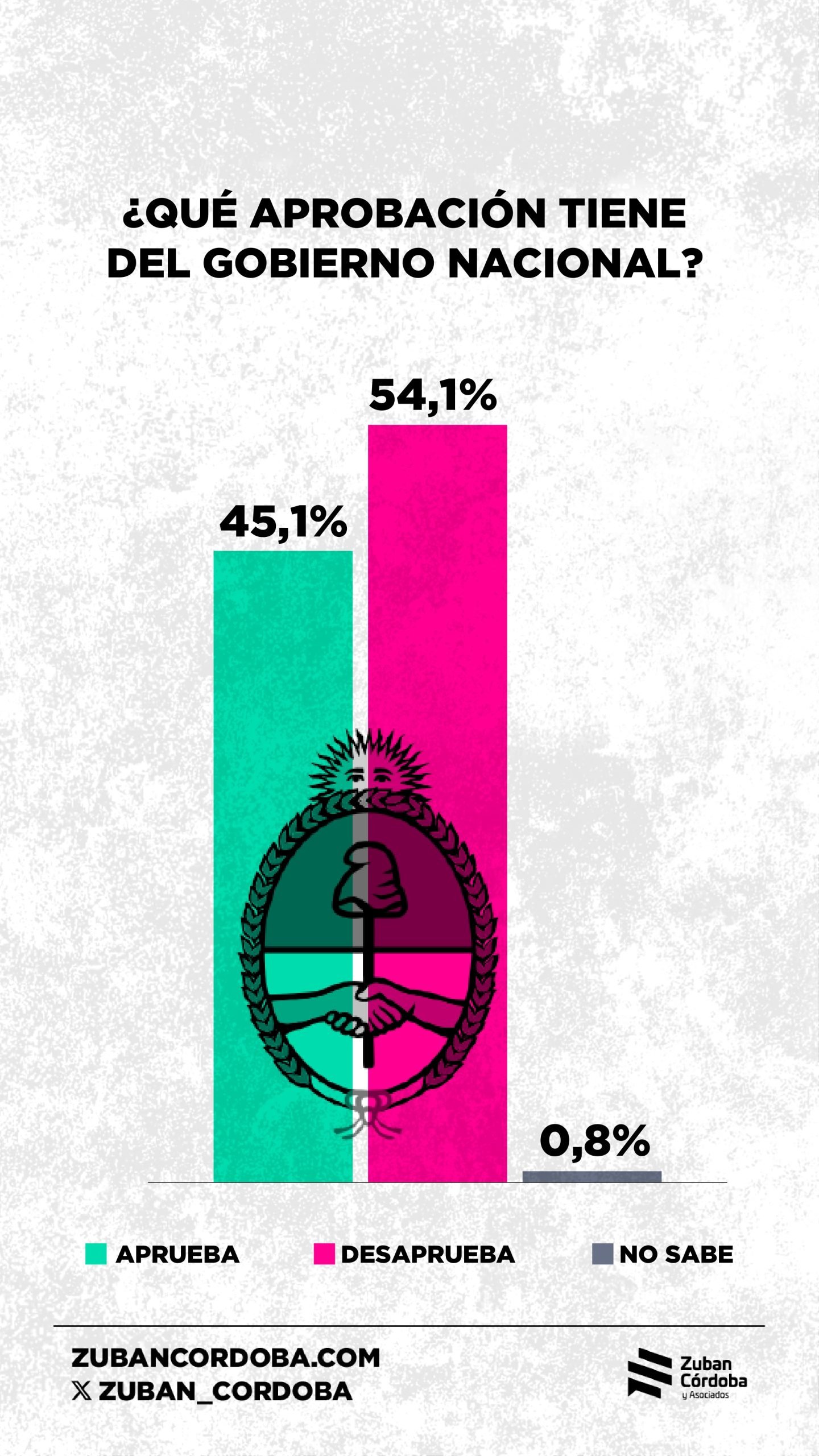 En relación a la aprobación del gobierno, un 54,1 (un aumento de dos puntos) lo rechaza contra un 45,1 que lo respalda mientas que la imagen negativa de Milei trepó a 53,8 por ciento, 1,3 mas que en la medición anterior.