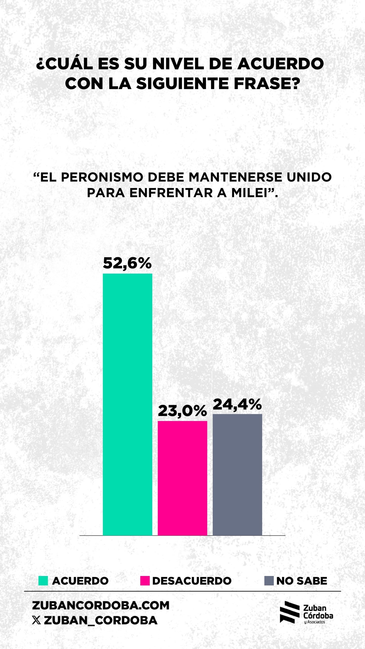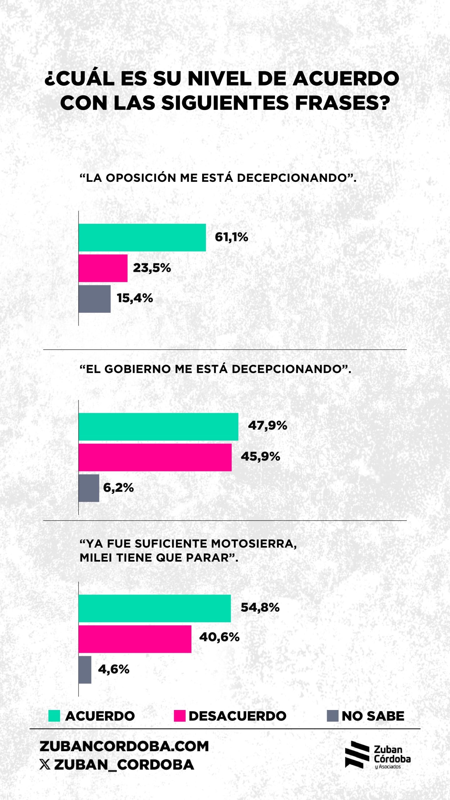 Sobre la oposición, un 52,6 pide un peronismo unido, más de un 50 reclama más resistencia de la CGT y un 61,1 dice estar decepcionado por la oposición. También hay un 47,9 que se siente decepcionado por el gobierno.