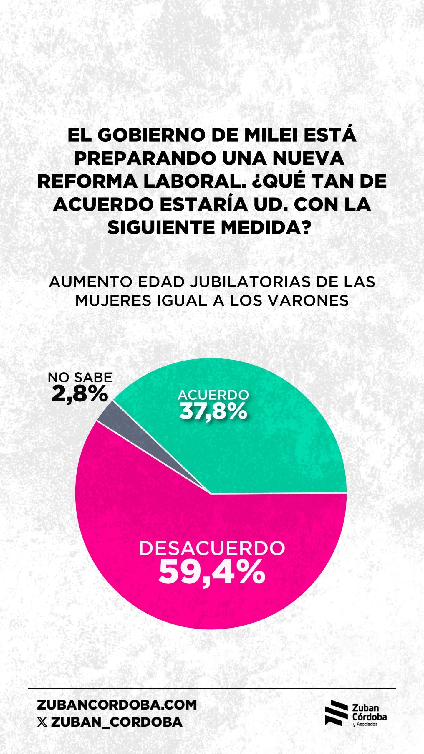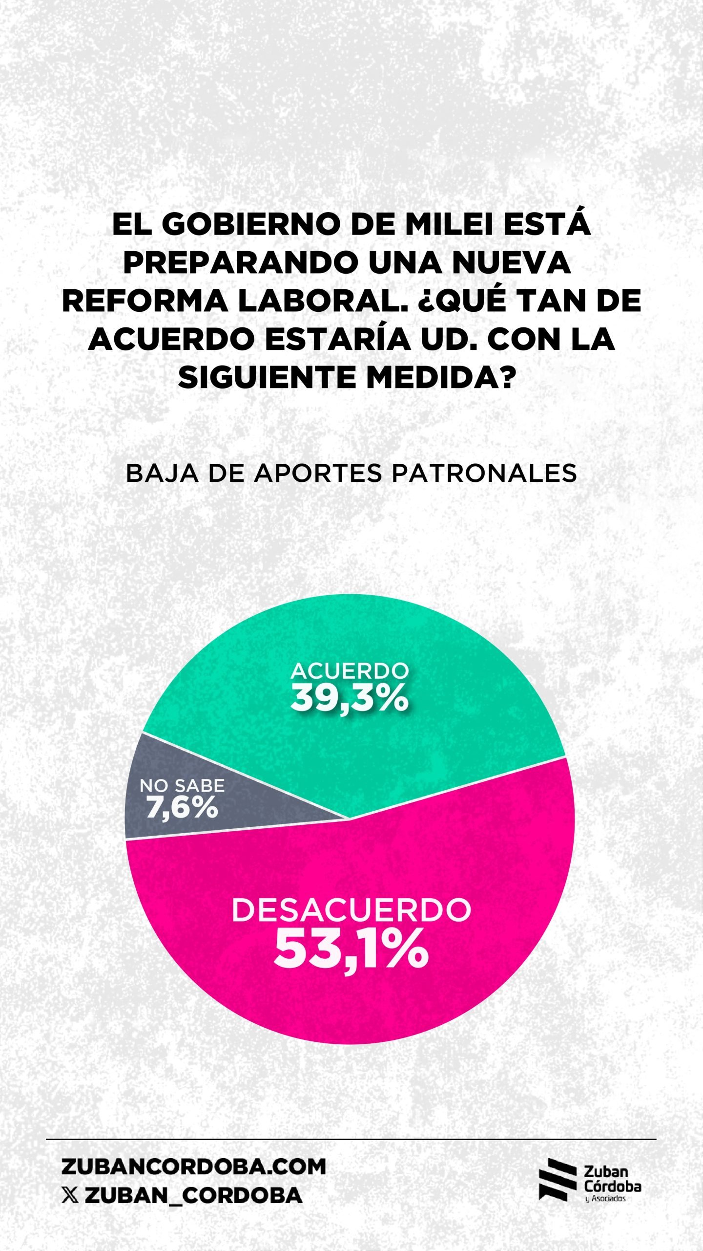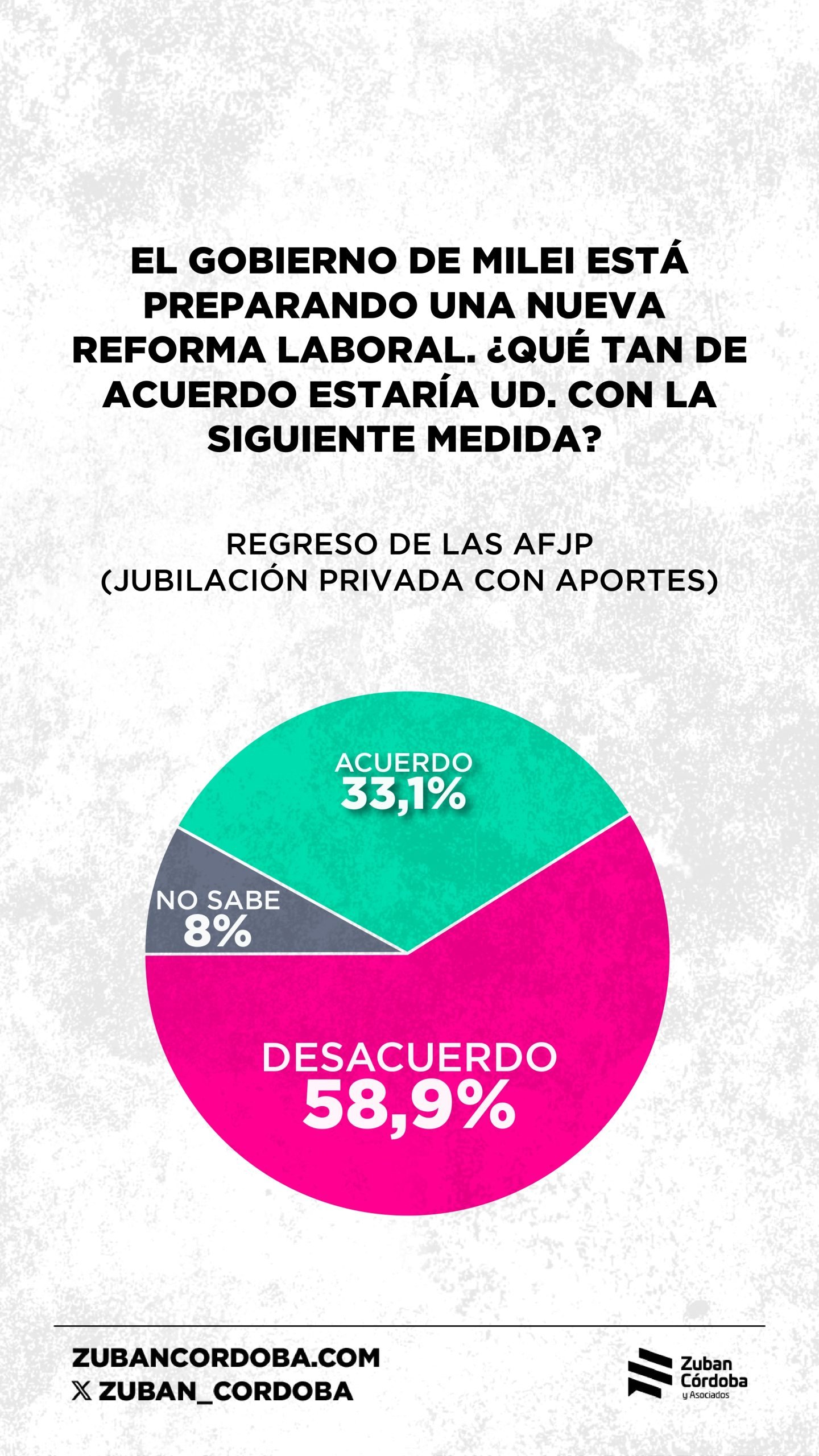 La encuesta hace referencia a una eventual reforma laboral y un retorno de las AFJP. Sobre lo primero, el 59,4 lo rechaza una nueva legislación para el mundo del trabajo mientras que un 58,9 no quiere la vuelta del sistema de jubilación privada. A su vez, el 54,6 considera que ya hubo suficiente motosierra, en un claro rechazo al ajuste.
