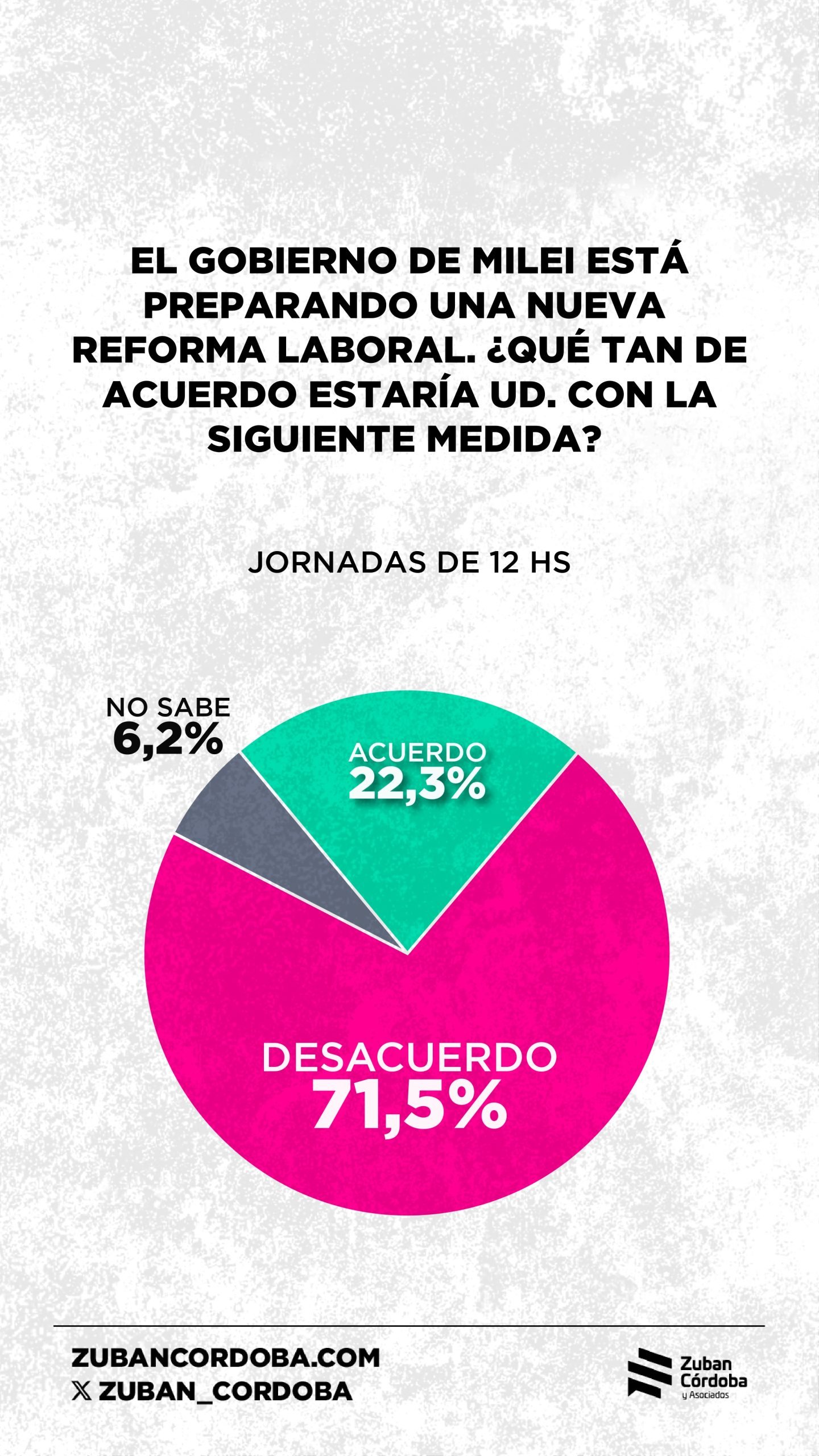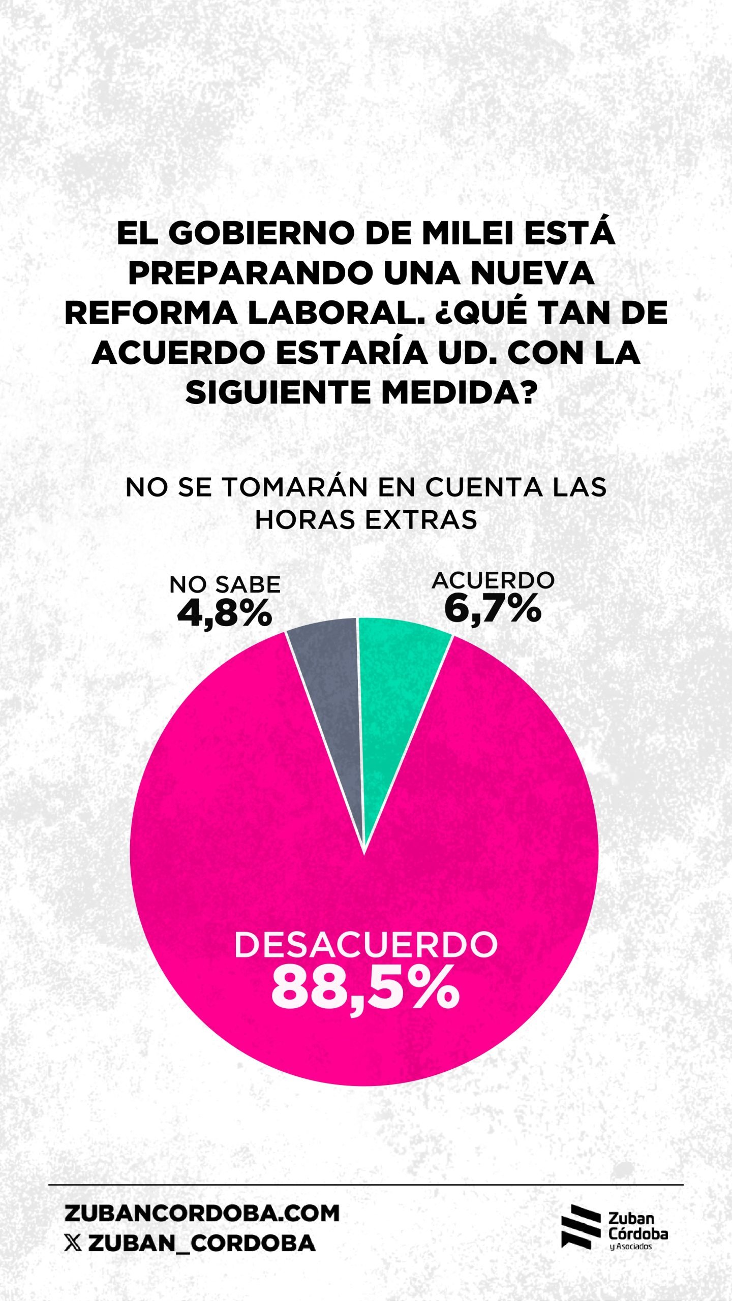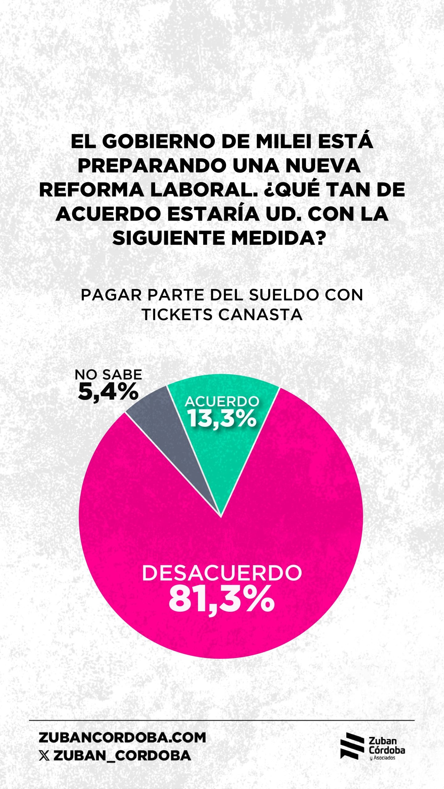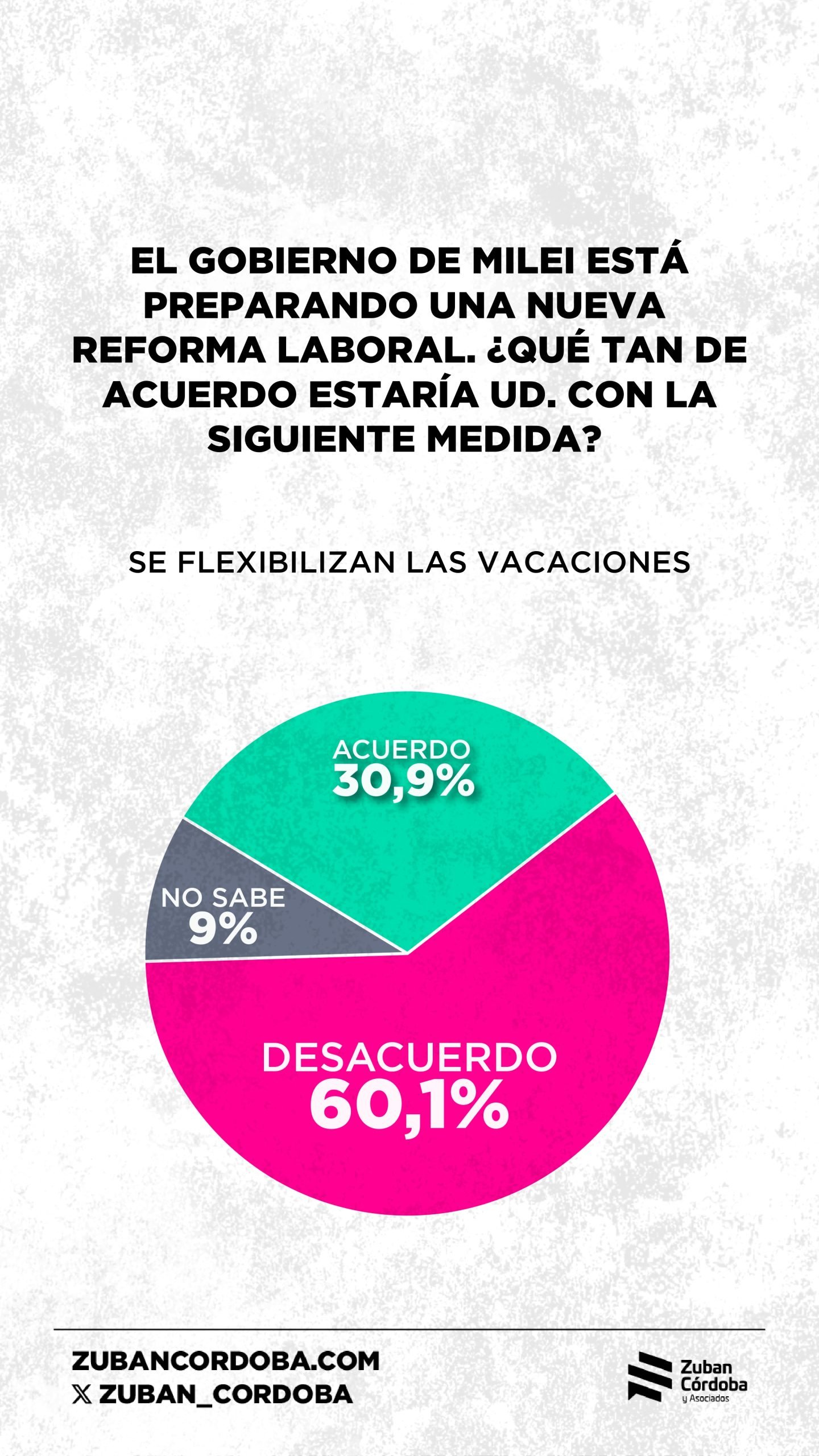 La encuesta hace referencia a una eventual reforma laboral y un retorno de las AFJP. Sobre lo primero, el 59,4 lo rechaza una nueva legislación para el mundo del trabajo mientras que un 58,9 no quiere la vuelta del sistema de jubilación privada. A su vez, el 54,6 considera que ya hubo suficiente motosierra, en un claro rechazo al ajuste.