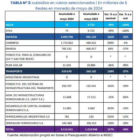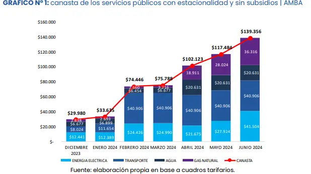 Ello se explica por “por consumos más elevados de gas natural y energía eléctrica conforme transita el pico estacional de invierno, por incrementos en el precio de la energía eléctrica y el gas natural a partir del primero de junio, y por la modificación de los bloques de consumo subsidiado en energía eléctrica y gas natural”, detallaron. En la desagregación por servicio se observa que el incremento más importante fue para el gas natural con un aumento del 1.117% respecto a diciembre de 2023 y es explicado tanto por el aumento de tarifas en abril y junio como por el consumo estacional en el pico invernal. A su vez, el gasto en transporte aumentó 410%, en energía eléctrica 234% y en agua 209%