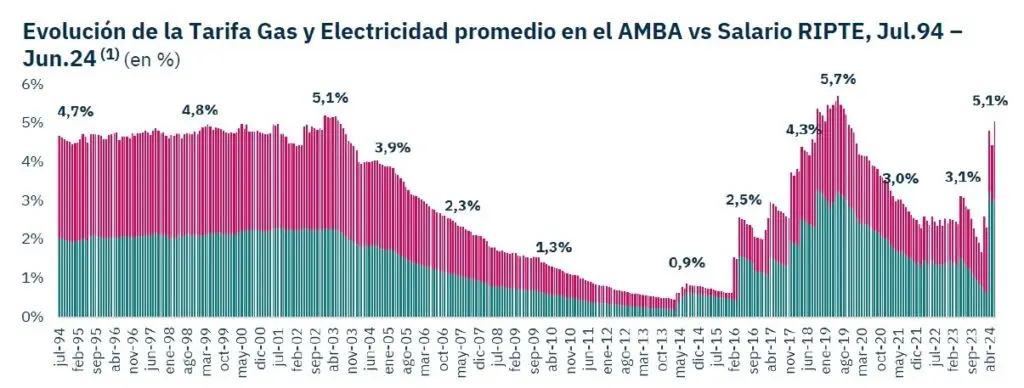 Según los economistas, “la alta incidencia de las tarifas de los servicios públicos se explica, fundamentalmente, por el retroceso de los salarios medidos en dólares, que en el primer semestre de 2024 se ubicaron en el valor más bajo de los últimos 20 años”, más allá de la suba tarifaria mencionada. El cálculo se realizó tomando como referencia un consumo de 250 KWh/mes de electricidad (R2) y 75 m3/mes de gas natural (R23), mientras que para el salario RIPTE se estimó una suba de 10,2% en abril, 9,1% en mayo y 8,7% en junio. Al respecto, el peso del gasto de tarifas se encuentra aún por debajo del 2019, tras el tarifazo de la gestión macrista, donde se ubicaba en 5,7%, aunque por ese entonces no regía la segmentación tarifaria actual, sin embargo, los datos del gobierno de Milei sí superan lo sucedido en el menemismo ya que entre 1994 y 2003, el peso promedio en los salarios era del 4,8%.