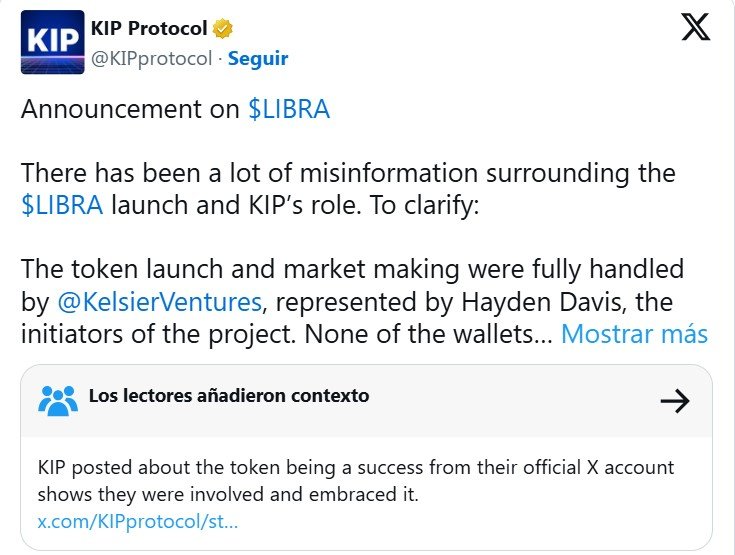 En una publicación en X luego del lanzamiento de $LIBRA, Kip Protocol mencionó que Milei “no estuvo ni está involucrado de ninguna manera en el desarrollo del proyecto que es absolutamente privado”.
