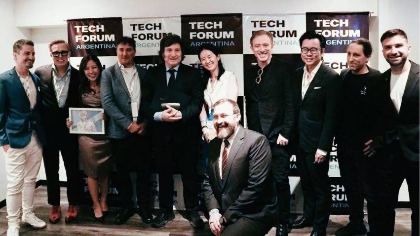 17/02/2025.- www.eldiarioar.com.- Foto portada: Javier Milei en el Tech Forum Argentina, en octubre de 2024. En la foto está Mauricio Novelli (primero desde la derecha), Julian Peh (tercero desde la derecha) y, acuclillado, Charles Hoskinson.