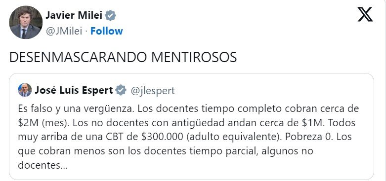 Ante un escenario de conflictividad creciente, el presidente Milei no hizo más que echar nafta al fuego desde su cuenta de Twitter: se pasó el día retuiteando insultos a las universidades y reclamos de auditorías. En unos de sus mensajes tituló: «DESENMASCARANDO MENTIROSOS». Lo que compartía era un mensaje de José Luis Espert quien arguyó que en las universidades «los docentes tiempo completo cobran cerca de $2M (mes). Los no docentes con antigüedad andan cerca de $1M. Todos muy arriba de una CBT de $300.000 (adulto equivalente). Pobreza 0. Los que cobran menos son los docentes tiempo parcial, algunos no docentes y $0 los ad honorem (escándalo). Muestren los datos». Son las mismas cuentas con las que los jubilados cobran «el triple en dólares»