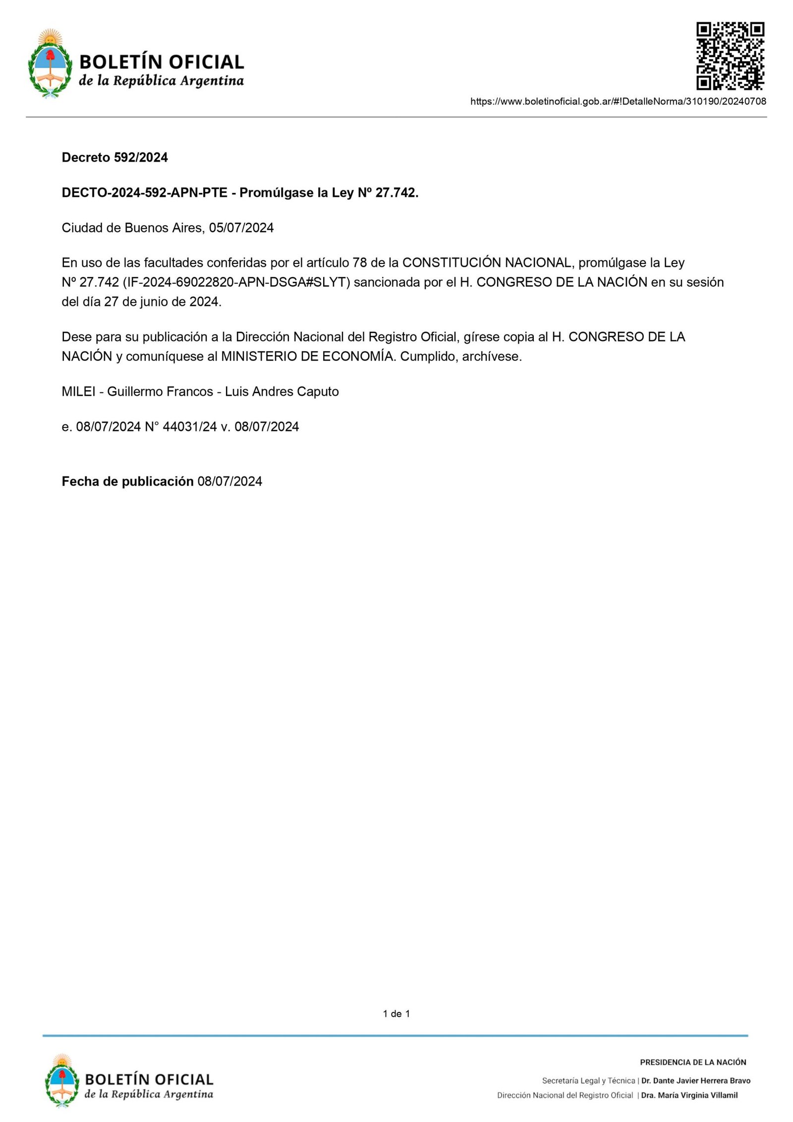 La promulgación de la Ley Bases fue hecha a través del decreto 592/2024 firmado por el presidente Javier Milei, el jefe de Gabinete, Guillermo Francos, y el ministro de Economía, Luis Caputo. El texto contiene solo tres párrafos de forma, sin aclaraciones, especificaciones ni variantes parciales a la ley que lleva el número 27.742