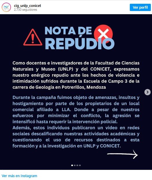 «Como docentes e investigadores de la Facultad de Ciencias Naturales y Museo UNLP y del Conicet expresamos nuestro enérgico repudio ante los hechos de violencia e intimidación sufridos durante la escuela de campo 3 de la carrera de Geología en Potrerillos«, comienza el escrito difundido en las redes sociales.