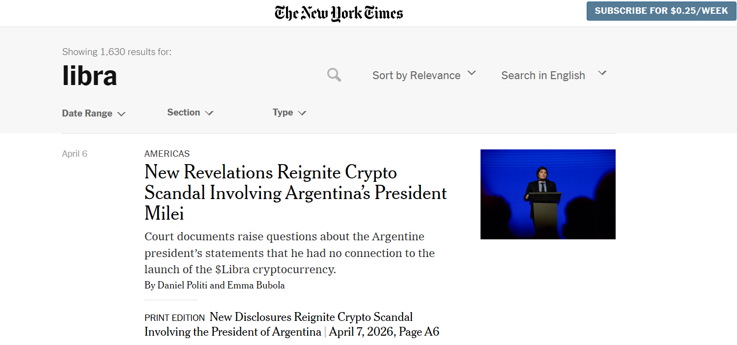 El escándalo por la criptomoneda $LIBRA volvió a estallar, esta vez con alcance global. El diario estadounidense The New York Times retomó el caso y lo proyectó a escala internacional con nuevos datos que vuelven a colocar al presidente Javier Milei en el centro de la escena, mientras la investigación judicial en Argentina sigue sumando piezas al rompecabezas.