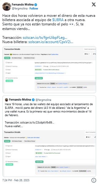 «Hace 19 horas, unas de las wallets del equipo asociado al lanzamiento de $LIBRA, movió parte del dinero (4.5 M de dólares) «de la Argentina» a una wallet nueva. Es la primera vez que vemos movimientos desde el 14 de Febrero», fue el primero de los posteos de Molina en Twitter. «Hace dos horas volvieron a mover el dinero de esta nueva billetera asociada al equipo de $LIBRA a otra nueva. Siento que ya nos están tomando el pelo. Si, te estamos viendo…», escribió más tarde, cuando registró el segundo de los movimientos.