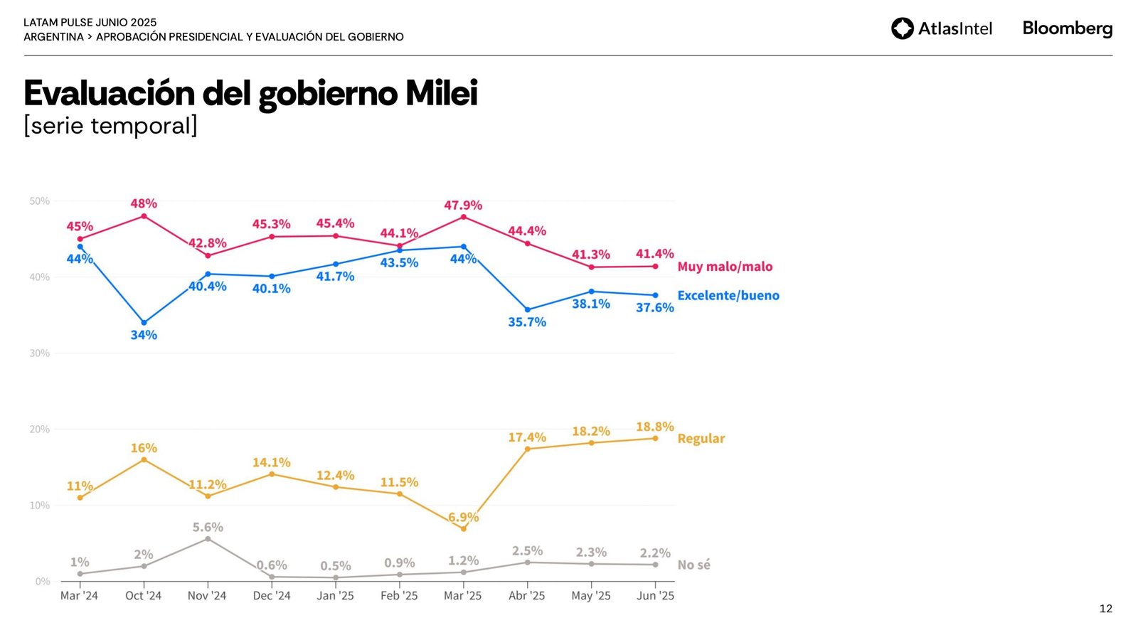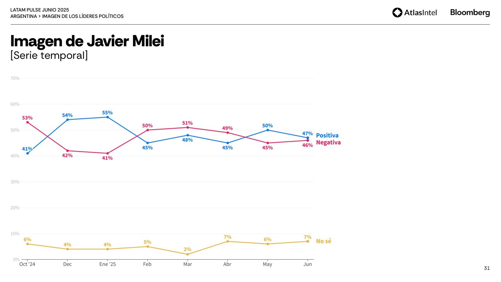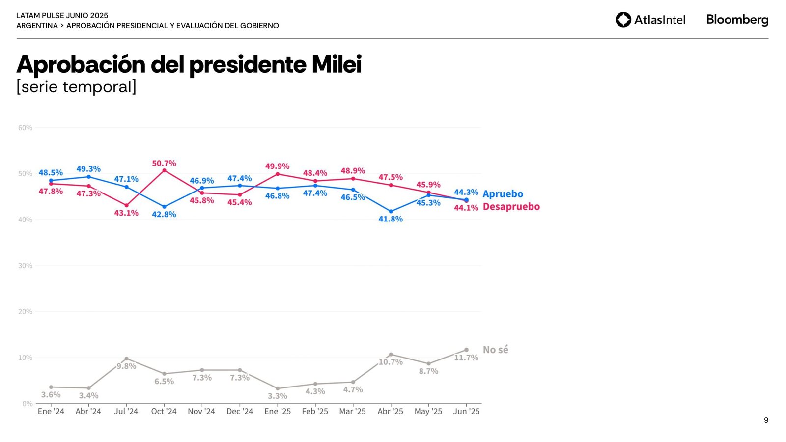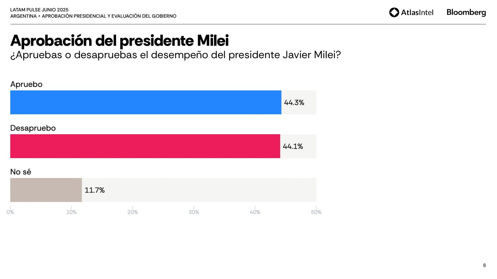 En cuanto a la aprobación de Javier Milei, un 44,3% aprueban su gestión y un 44,1% la desaprueba. A su vez, en relación a la evaluación del gobierno, el 41,4% lo considera «malo o muy malo» y el 37,6% «excelente/bueno». Sobre la imagen del jefe de estado se destaca una caída de tres puntos, de 50 a 47 en un mes.