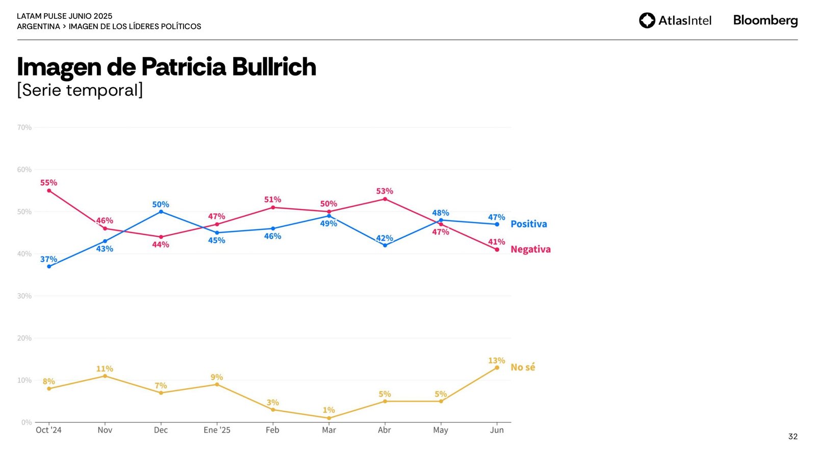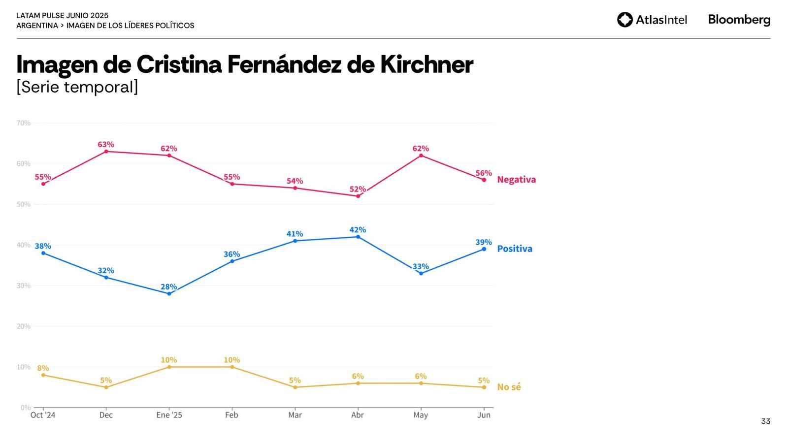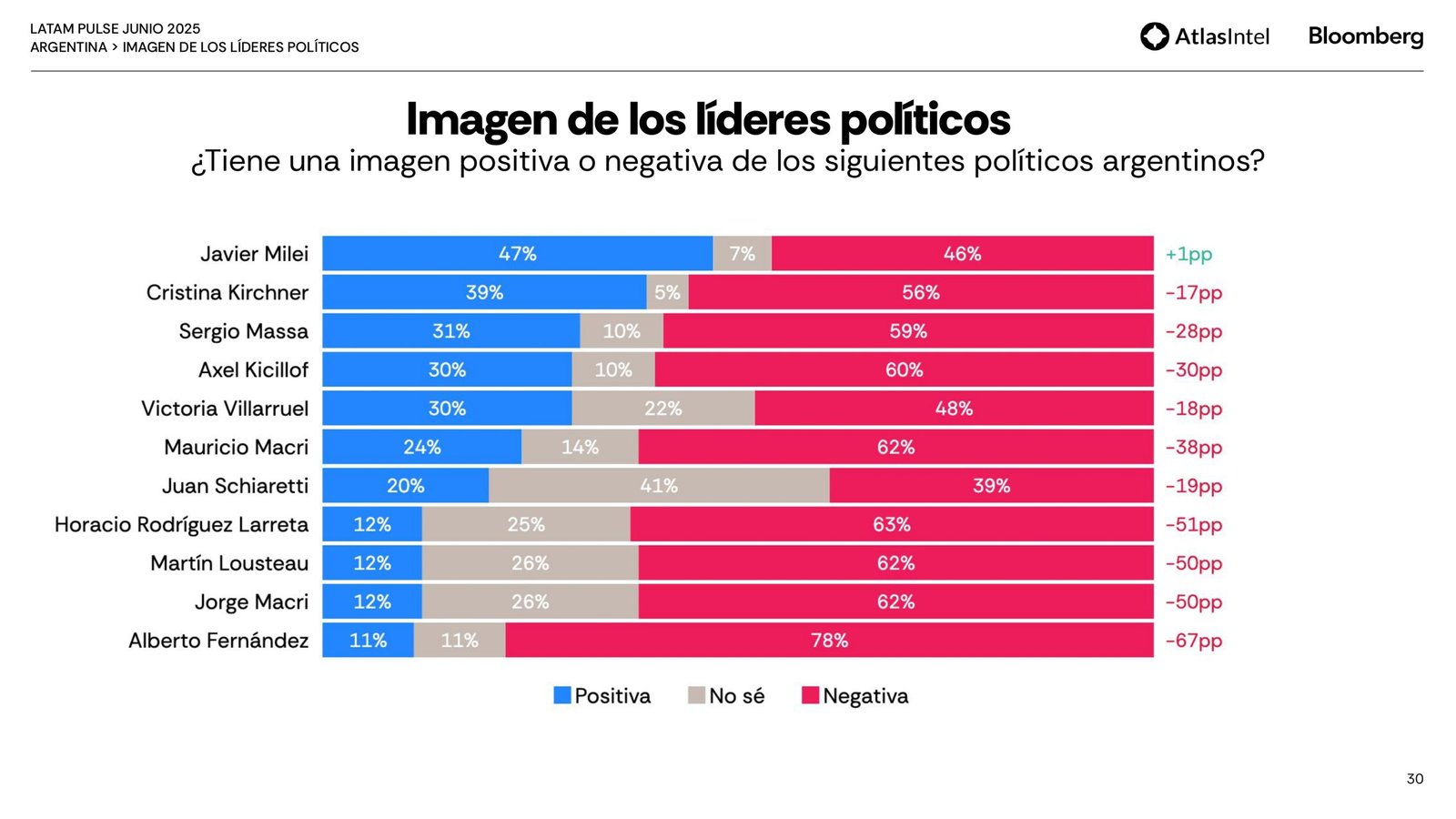 Por último, Atlas remarca una recuperación de la imagen de Cristina que dio un salto de 6 puntos para ubicarse en 39 por ciento con una imagen negativa de 56 puntos, 6 menos que el mes pasado.