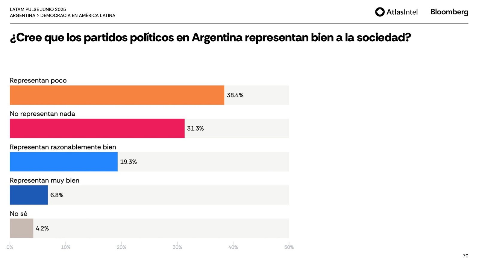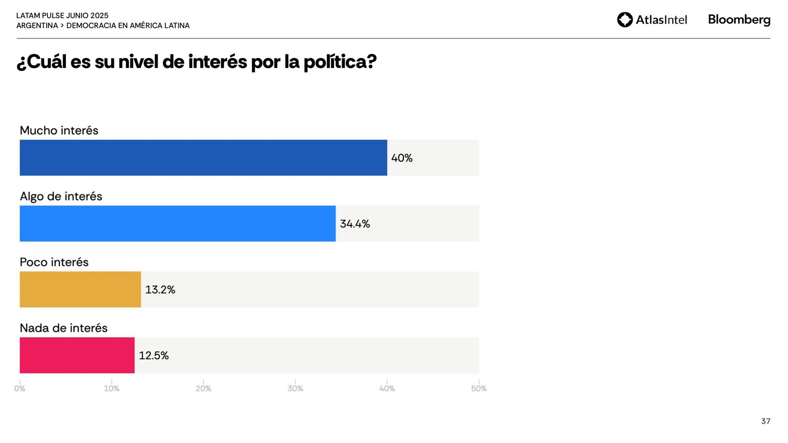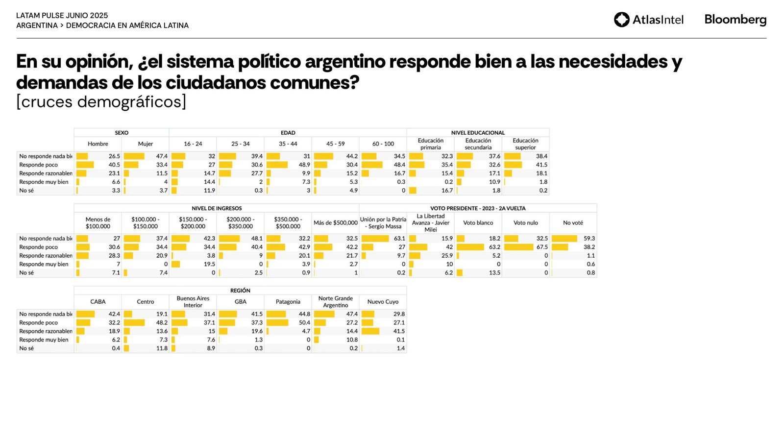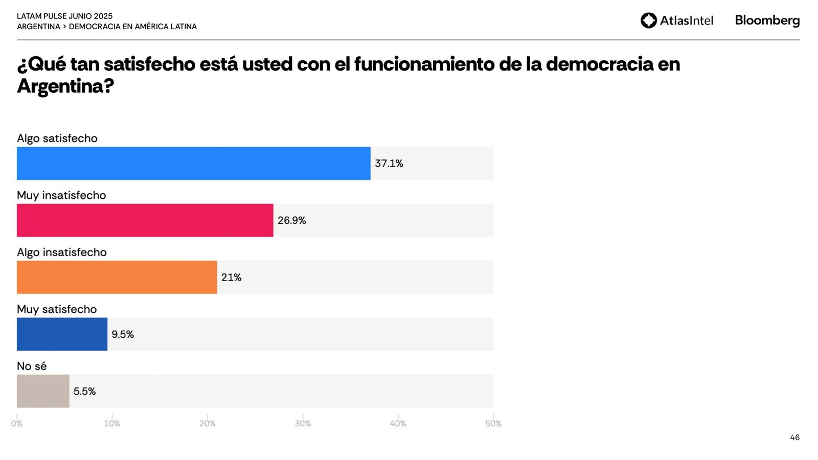 Sin embargo, la mayor parte de la población está solo parcialmente satisfecha con el funcionamiento de la democracia (37,1%) y considera que responde poco (37%) o nada (37%) a las necesidades y demandas de los ciudadanos comunes.