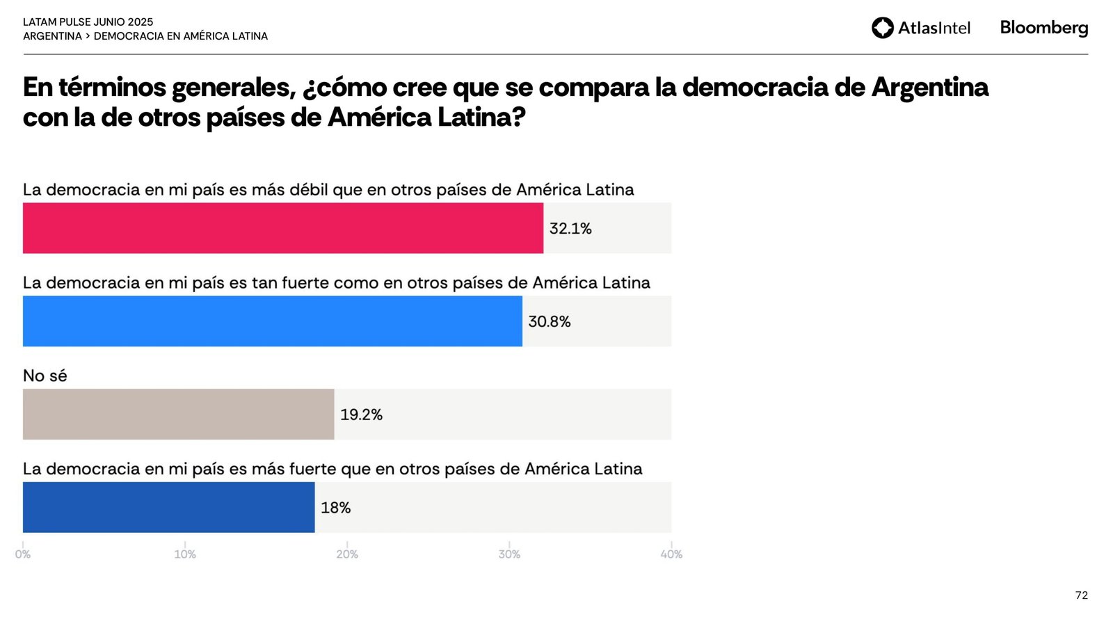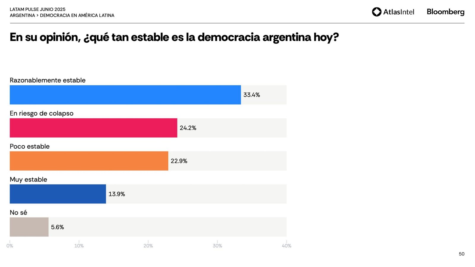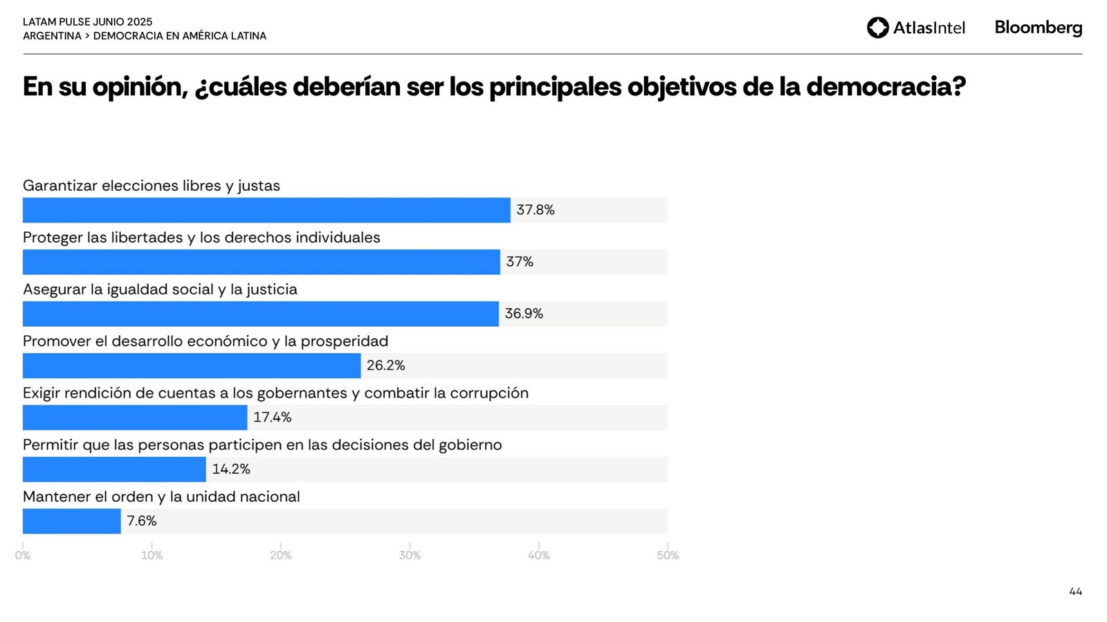 Sin embargo, la mayor parte de la población está solo parcialmente satisfecha con el funcionamiento de la democracia (37,1%) y considera que responde poco (37%) o nada (37%) a las necesidades y demandas de los ciudadanos comunes.