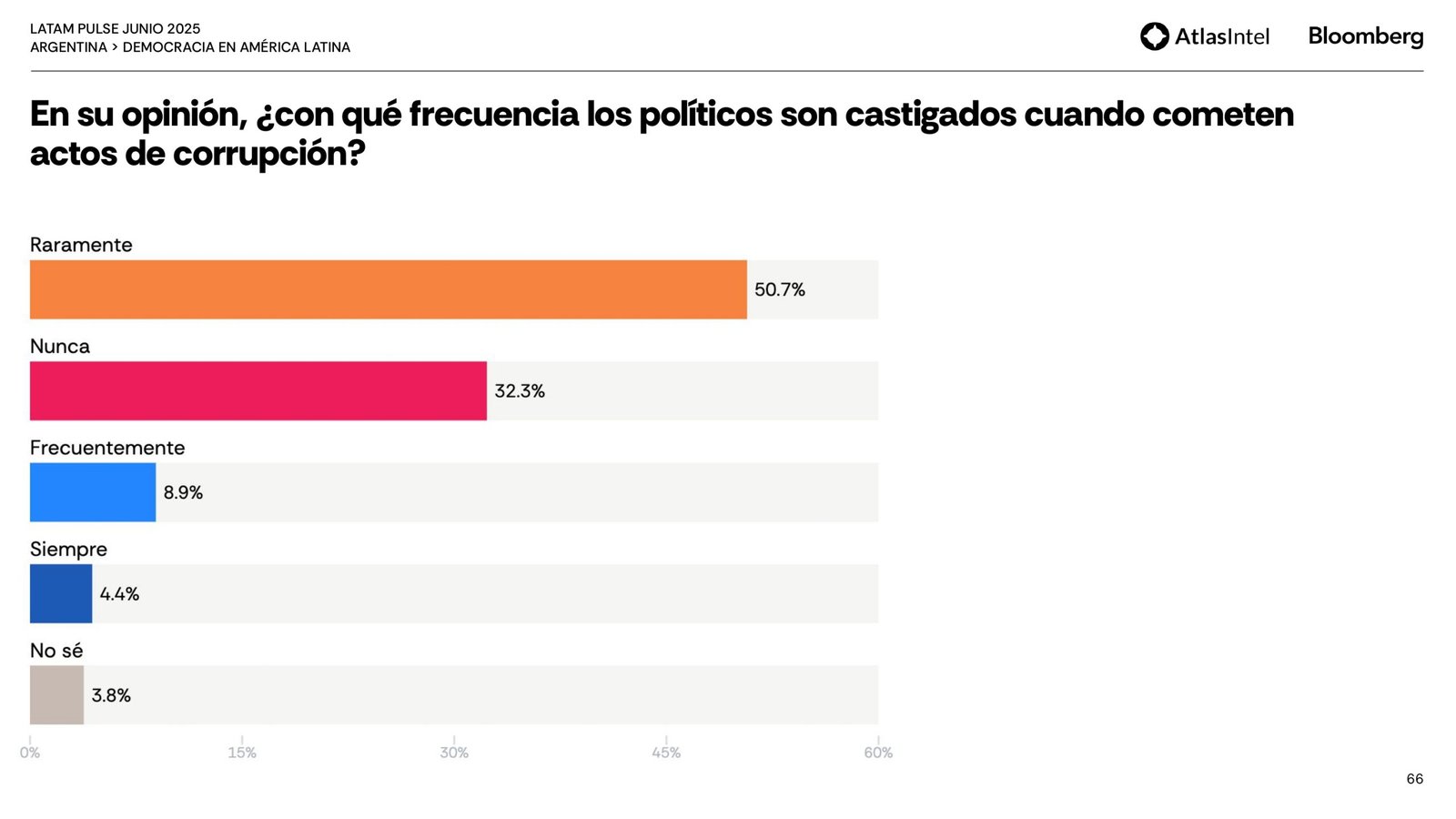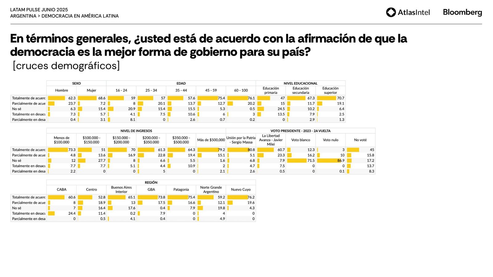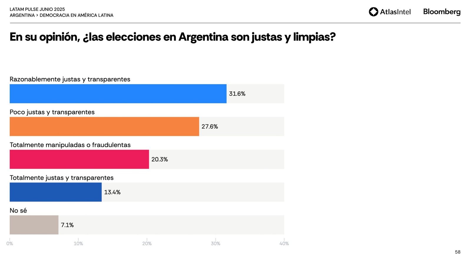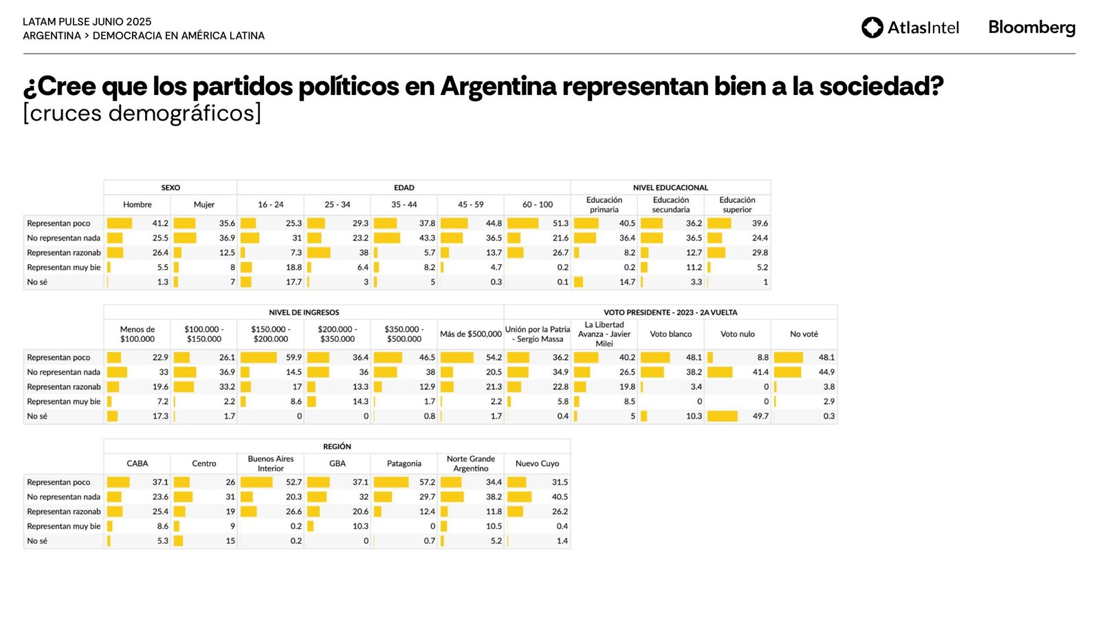 Sin embargo, la mayor parte de la población está solo parcialmente satisfecha con el funcionamiento de la democracia (37,1%) y considera que responde poco (37%) o nada (37%) a las necesidades y demandas de los ciudadanos comunes.