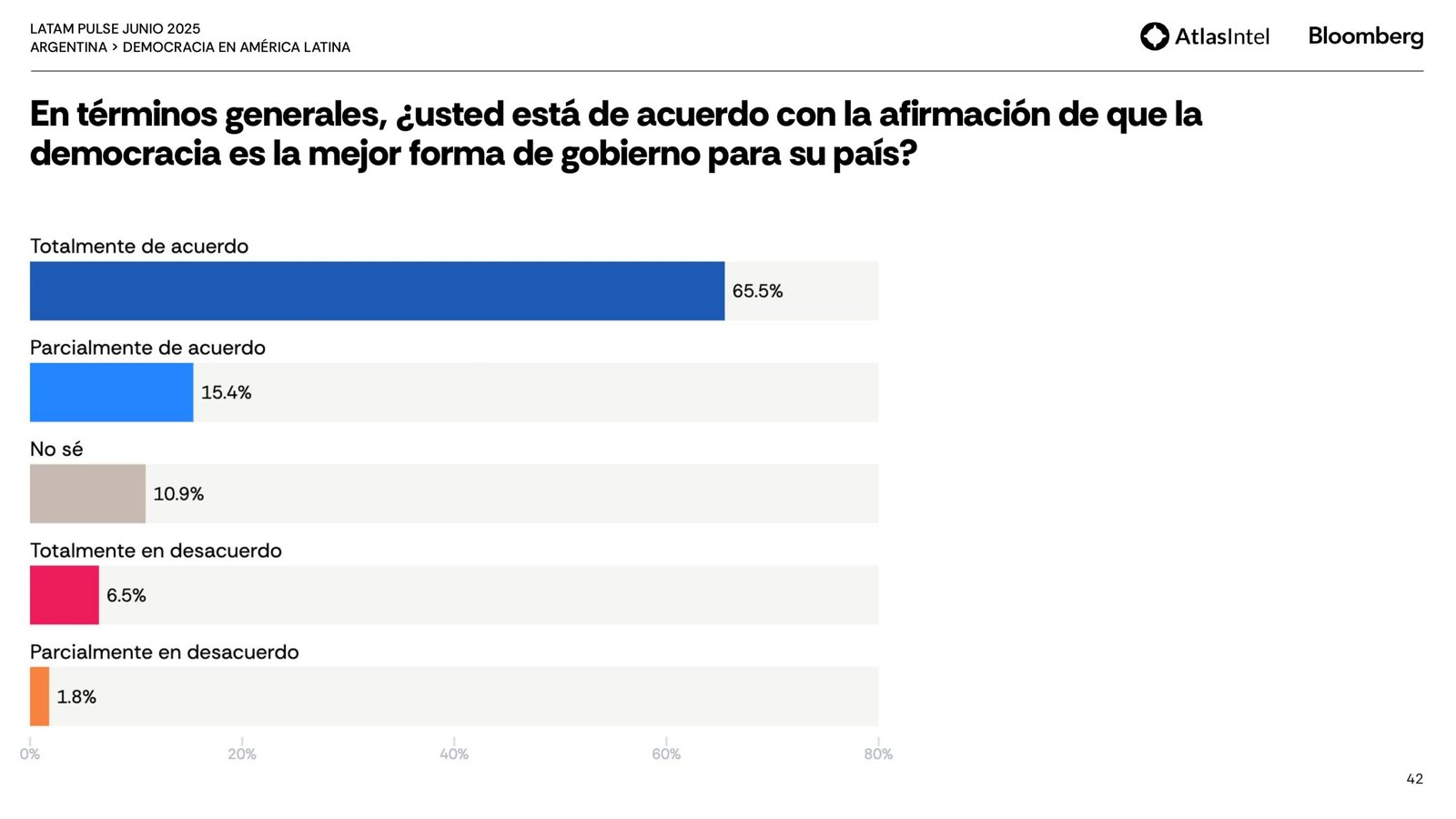 La encuesta también consulta sobre la democracia. En sentido, el 65,5 por ciento concuerda plenamente en que la democracia es la mejor forma de gobierno para el país y para gran parte de los entrevistados, la democracia se basa en un trinomio fundamental: garantizar elecciones libres y justas (37,8%), proteger las libertades y los derechos individuales (37%) y asegurar la igualdad y la justicia (36,9%).